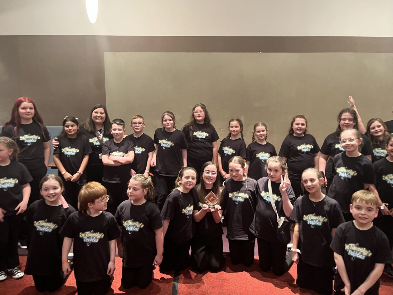 Congratulations to the school Glee choir, ‘St Timothy’s Trebles’, who won the ‘Espirit de Glee’ award at the West of Scotland Glee festival at Hamilton Town House last night. Please see below for a picture of them with their trophy! We have certificates for them too which we’ll get names on and given out as soon as we can.