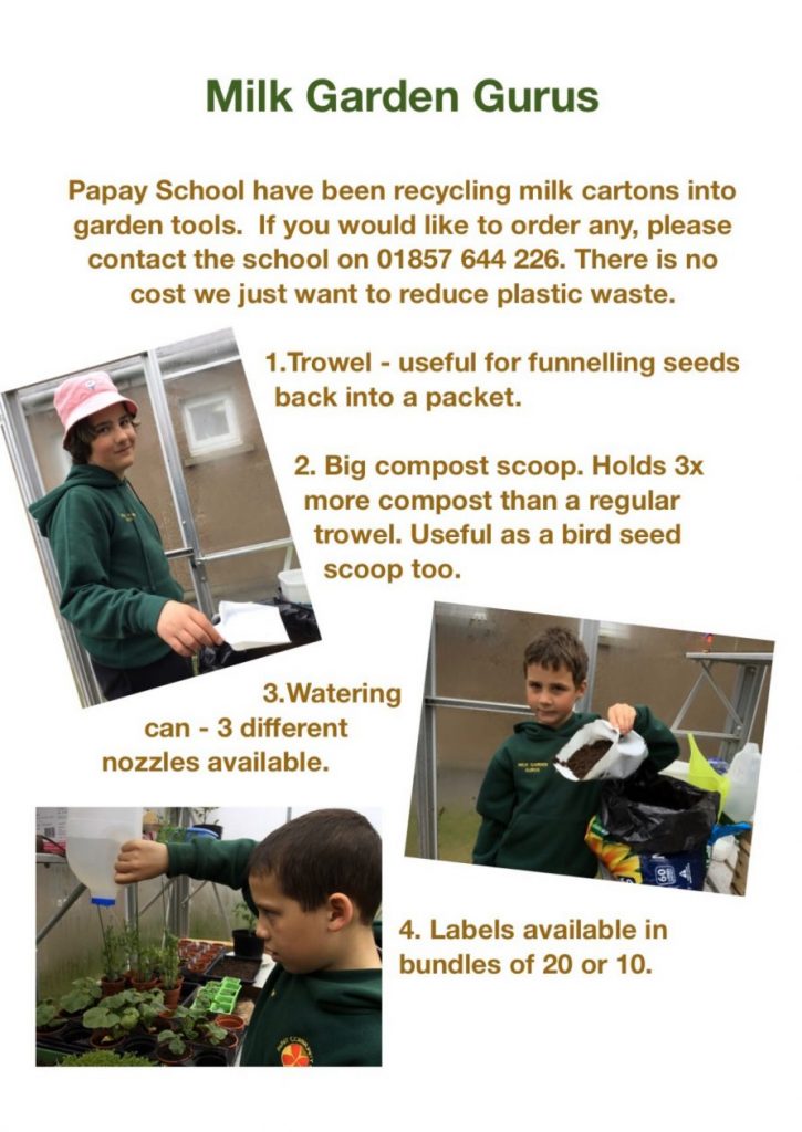 One project we’ve been working on is related to recycling plastics. The Milk Garden Gurus are now taking orders for a range of home-made gardening tools, all made from recycled milk bottles. Please see the poster below and contact the school to make and order.