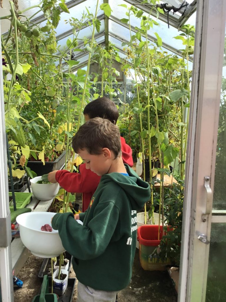 After break today we picked some tomatoes for our lunch. We also picked spinach, a variety of lettuces and cucumber. There are lots of things in the greenhouse and most things have grown. The strawberries have stopped growing, and the plant has produced all the strawberries it can this year.