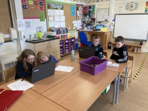 P1-4 are making PowerPoints about different jobs in Shapinsay and Orkney. They wrote to lots of people to find about the jobs, and are now putting the information in PowerPoints. P4s are doing a great job at helping the younger children.