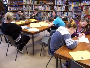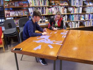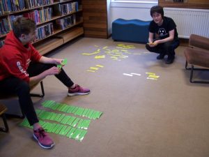 In the afternoon, Mrs Hunter’s Higher English class (two periods) were revising their key texts, Doctor Jekyll & Mr Hyde and Romeo and Juliet using interactive group working to identify and memorise key quotations. Three groups are searching for quotations from Romeo Juliet in the library, their classroom and English corridor – one member goes to find the quotation, memorise it and return to the library a recite it to another member of the group who writes it down and they swap round. Another three groups are looking at a stack of quotations from Doctor Jekyll & Mr Hyde and with group discussion are sorting them by a method of their own choice, eg. character, setting, themes. The atmosphere in the library at this point is a studious buzz with all the pupils actively engaged.