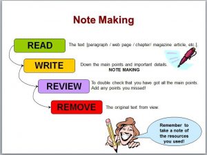 Note making took place last week. It involves pupils being given a presentation on how to take notes, including emphasis on using their own words and not copying and pasting unless using direct quotes, and touching upon plagiarism. They are then given the opportunity to practise a few note making styles.
