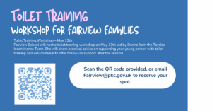 We are pleased to let you know that Fairview School will be hosting a toilet training workshop on May13th, 10-12pm. The session will be led by Donna from the Tayside Incontinence Team, who will share practical guidance and advice on the most effective ways to support a young person through their toilet training journey.