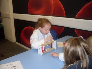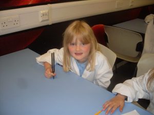 After lunch they put on lab coats and carried out a number of experiments related to our senses and how liquids react with each other.
