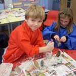 P2/3 have been doing decoupage to decorate their scrapbook for homework. This was a popular activity in Victorian times. It involved cutting out pictures of your favourite things and overlapping them. A coating of glue was then brushed over to give a shine. Flowers were very popular in Victorian times, but we also stuck on our favourite toys.