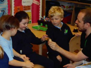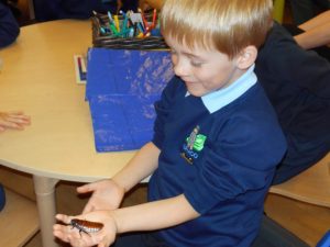 Alex showed the children many animals from the Rainforest. Some of the creatures that the children had the fortune to see and hold were the Madagascar Hissing Cockroach, a Giant Millipede, the Giant African Snail, a Chilean Tarantula, a Tree frog, a Crested Gecko, a Corn Snake and Rats!