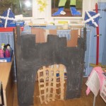 We built it from cardboard, painted it, made a portcullis from material and put flags on top!