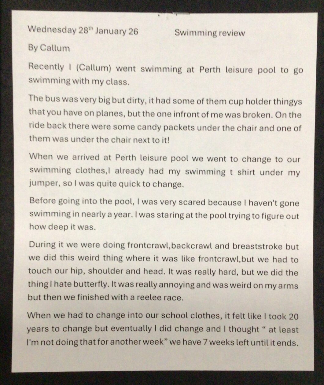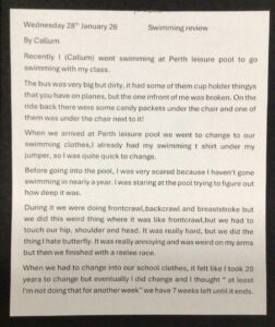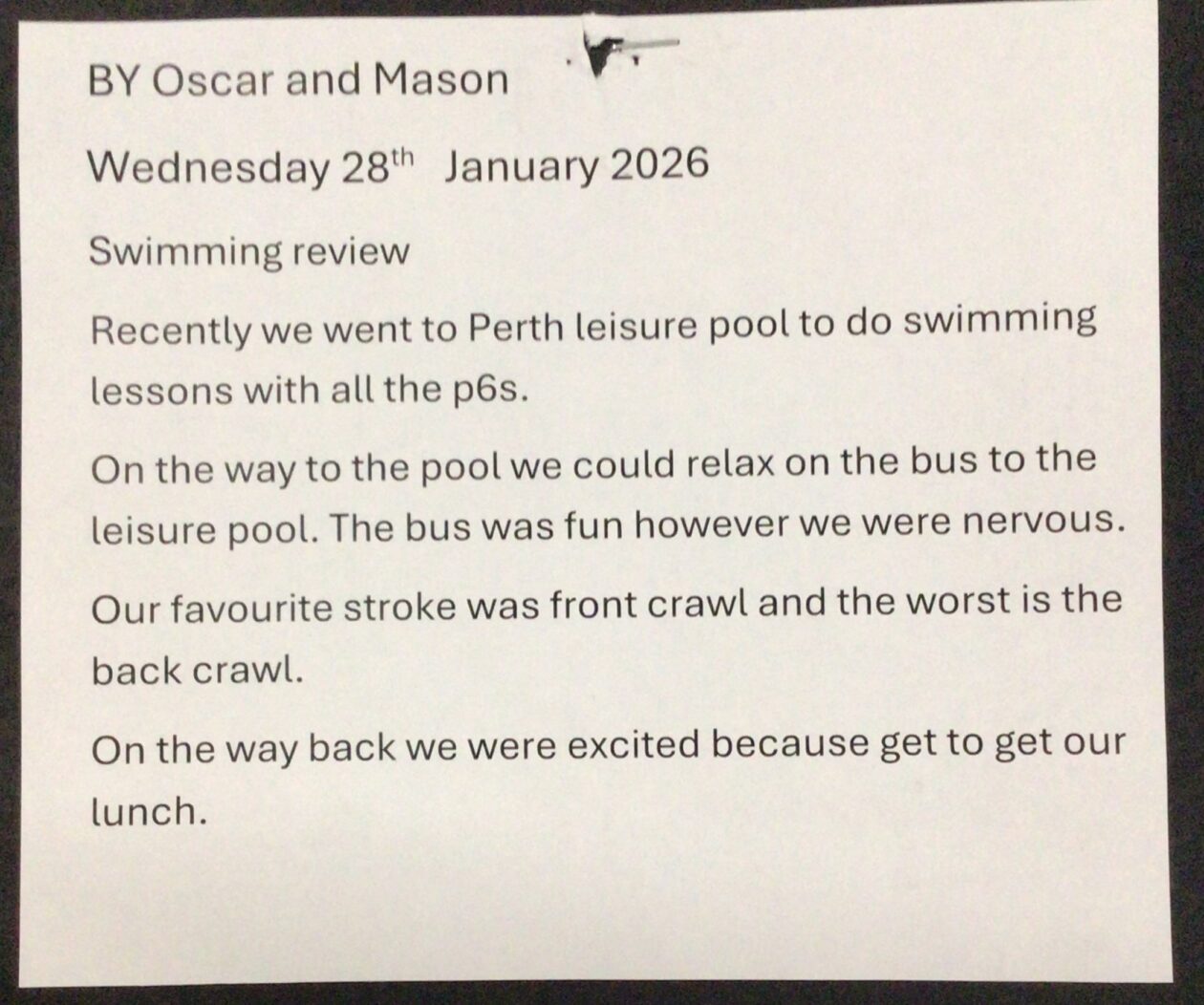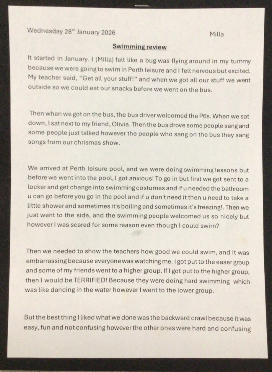 P6 have been attending swimming lessons and have created art work and written swimming reviews.
