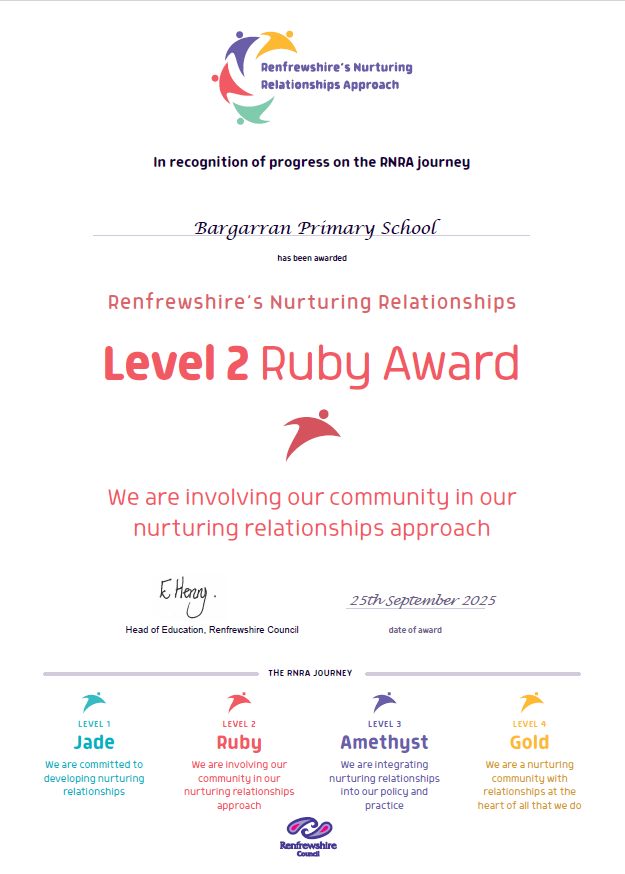 Here at Bargarran Primary, we are committed to providing a nurturing, inclusive, and stimulating environment where every child feels safe, valued, and inspired to learn. Our dedicated team of staff work in partnership with families and the wider community to support each child’s development—academically, socially, and emotionally.