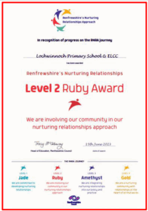 Renfrewshire’s Nurturing Relationships Approach (RNRA) We were delighted to receive the Ruby Award, recognising our strong commitment to embedding nurturing approaches throughout our school community and reflecting the values that underpin everything we do.