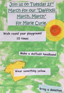 On Tuesday 23rd March, Riverbrae are asking all pupils in school and the ELCC, to wear something yellow to support Marie Curie. All classes will carry out a march around their playground, this is not sponsored but all donations would be appreciated. You will also receive some sunflower seeds with instructions as to how to plant them. It would be lovely if you could send pictures of your child planting the sunflower seeds and then pictures when they grow, the pictures can be sent through your child’s learning journal. Many thanks
