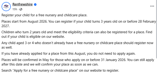 Applications and full details can be accessed here: https://www1.renfrewshire.gov.uk/article/9741/Apply-for-a-free-nursery-or-childcare-place