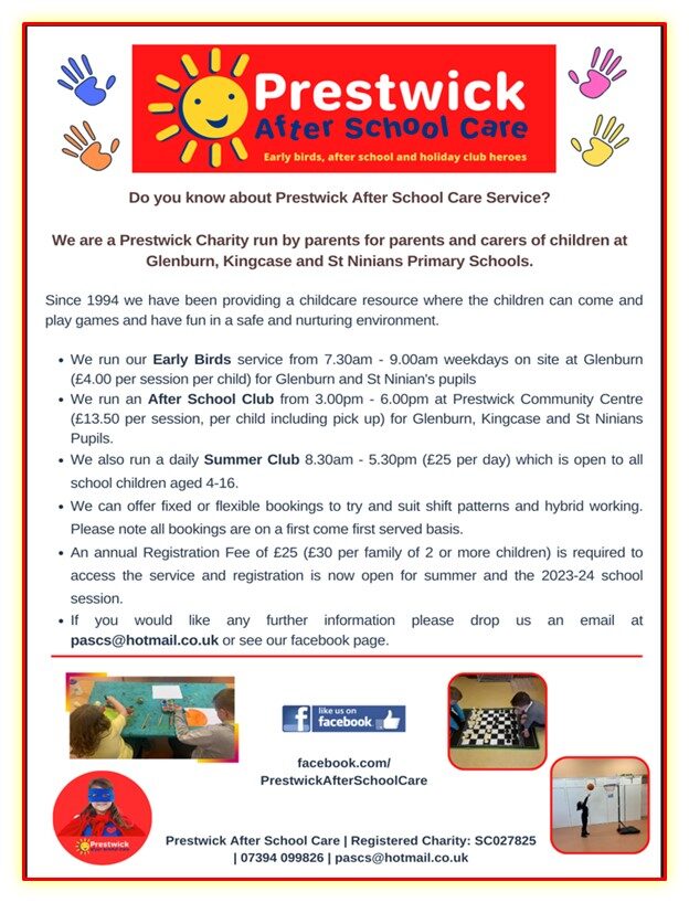 Breakfast & After School Club Details Please see links below for information on Breakfast and After School Club details. Breakfast Club Prestwick After School Care Share this: Click to share on Facebook (Opens in new window) Facebook Click to share on X (Opens in new window) X
