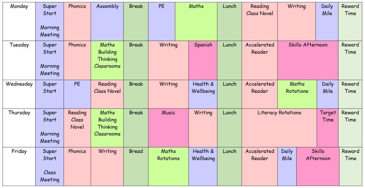 This is our class timetable. We have PE on Monday and Wednesday!