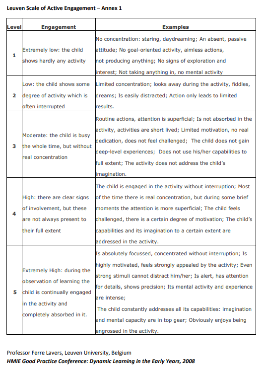 Education, Leuven University, Belgium, and the Leuven Scale creator. These are two scales that practitioners can use to measure the levels of wellbeing and involvement in children during play.