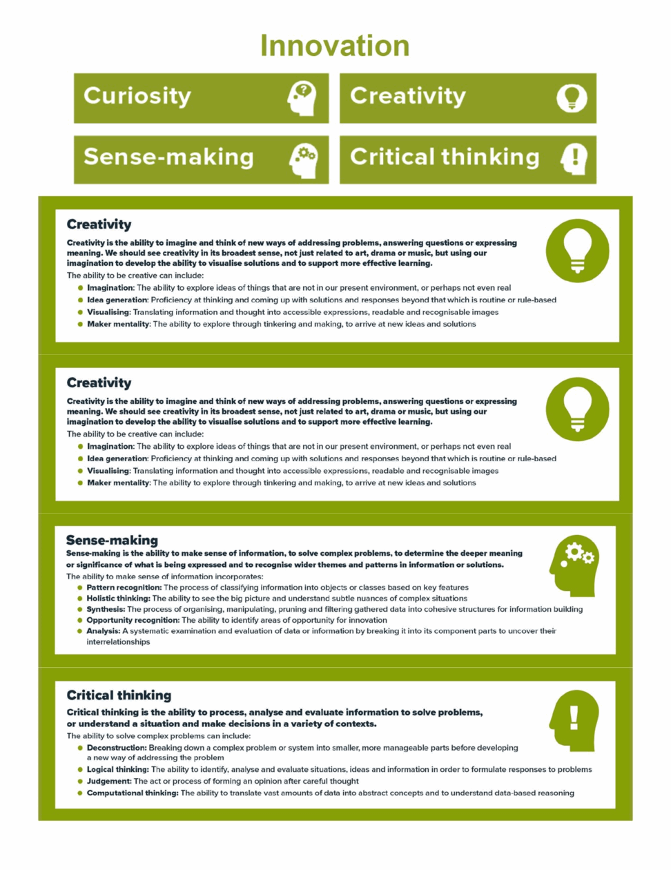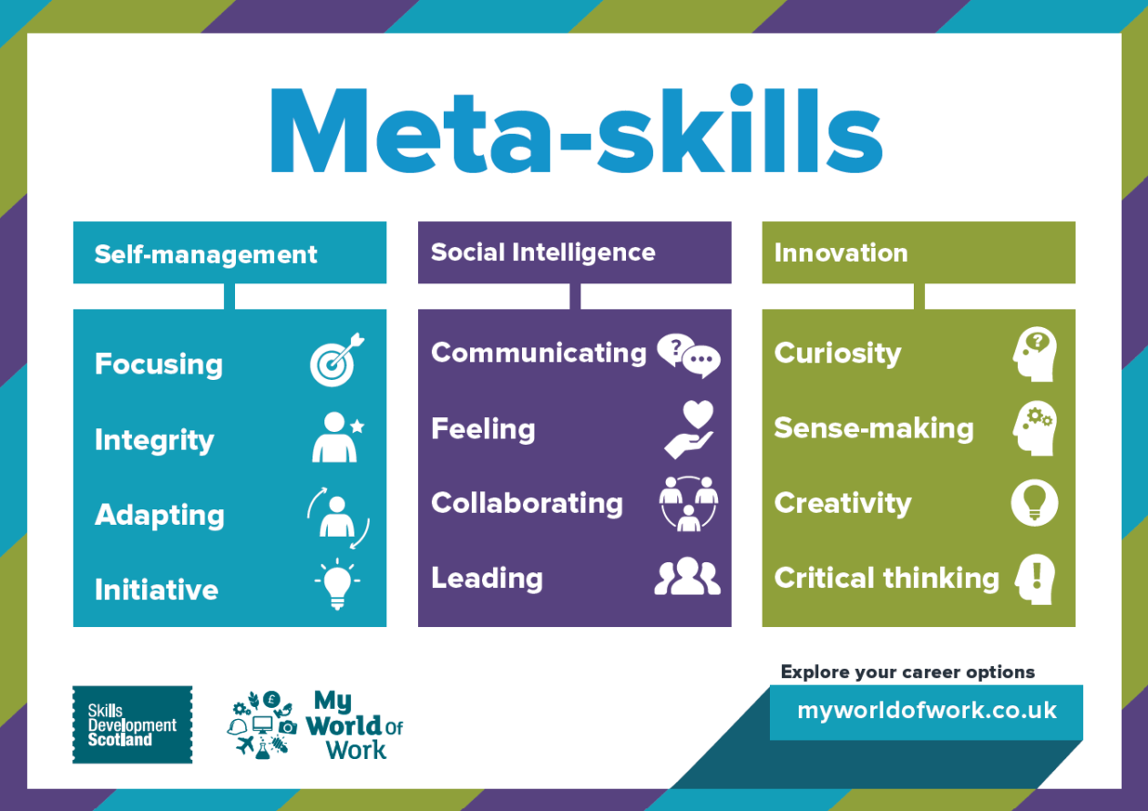 “Meta-skills are innate, timeless, higher-order skills that create adaptive learners and promote success in whatever context the future brings. From birth, children use their meta-skills as they test and explore the world around them, and it is these meta-skills that act as a key to unlock the development of other transferable and technical skills. Therefore, it is important that as children and young people progress through their education, practitioners make meta-skills explicitly visible and create opportunities for learners to recognise, understand and explore their meta-skills development.“
