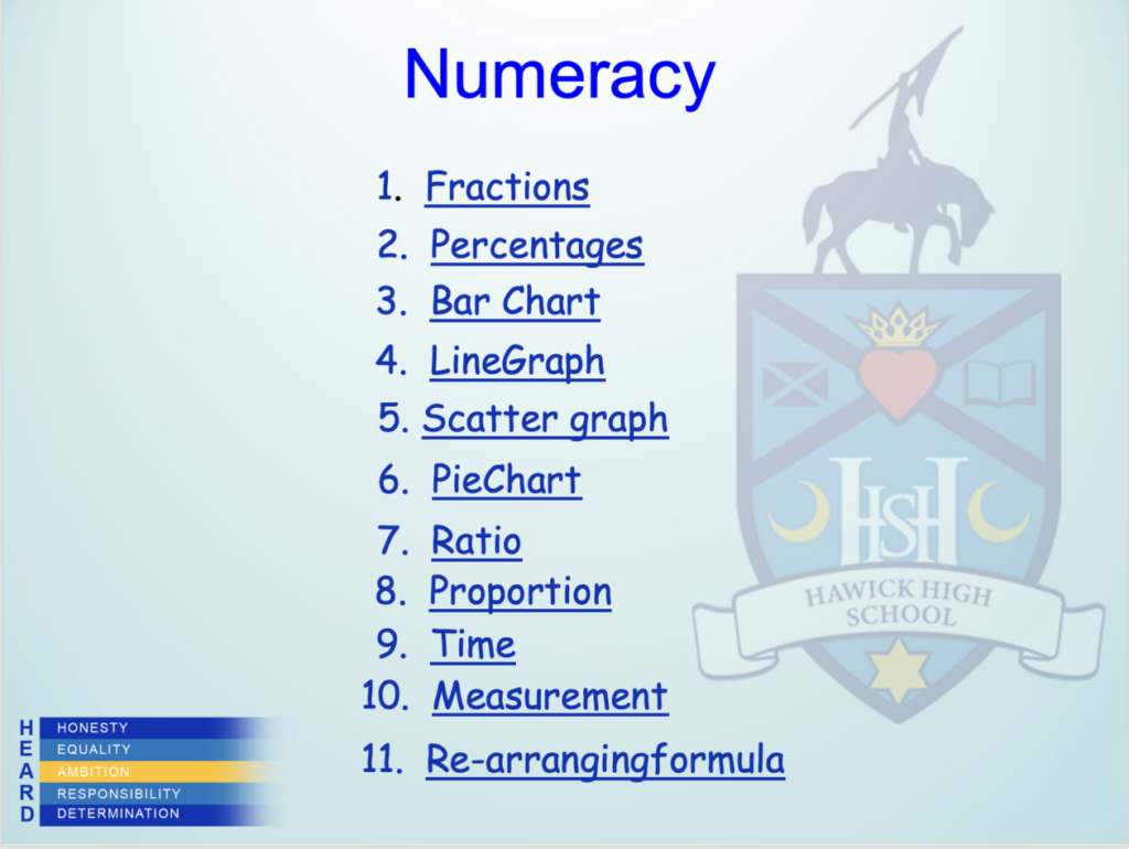 This Numeracy PowerPoint has been designed to support a consistent approach to numeracy across Hawick High School. It demonstrates how to tackle 11 different types of sums, giving pupils clear step-by-step guidance and ensuring staff and learners are using the same strategies in every classroom. Click the image to access.