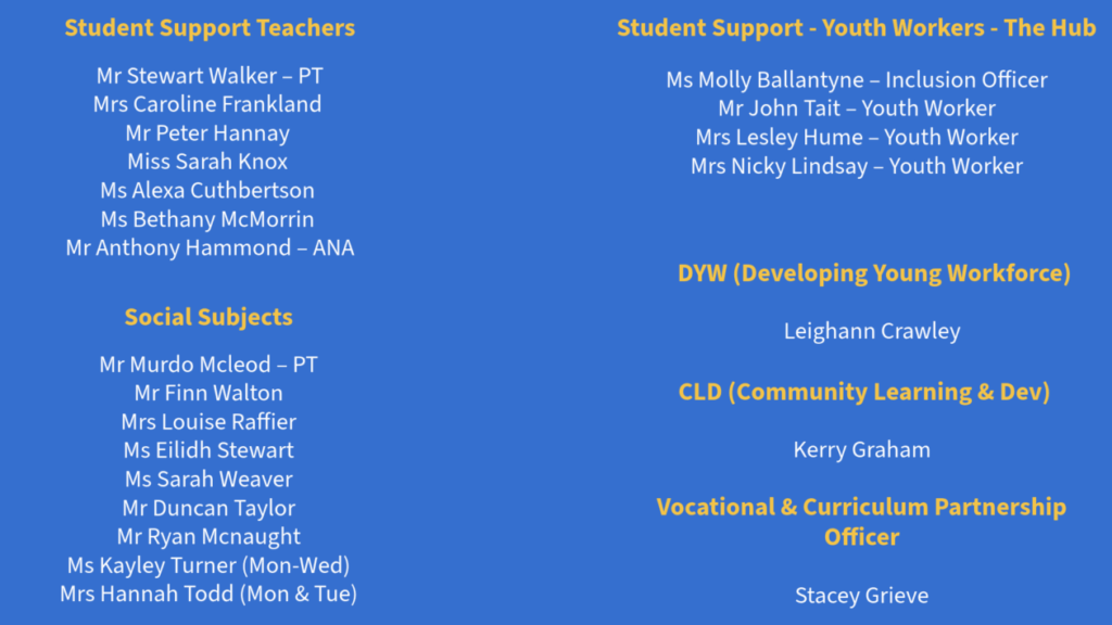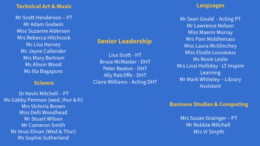 At Hawick High School, we are proud of the dedicated team who support our young people every single day. From our senior leadership team and teaching staff to our skilled admin and office teams, technicians, support staff, and janitors, every member of our community plays a vital role in the life of our school.