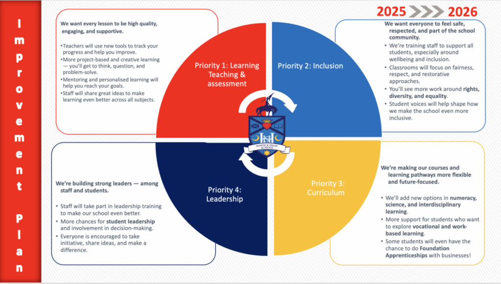 Our School Improvement Plan sets out Hawick High School’s key priorities for the year ahead. It focuses on raising attainment, promoting wellbeing, and ensuring every young person has access to high-quality learning experiences. Working together with our community, we aim to build on our strengths and continue to make Hawick High the best it can be.