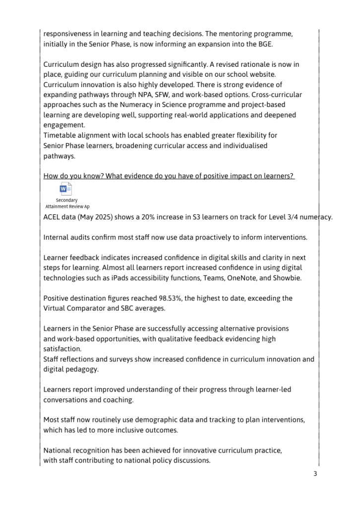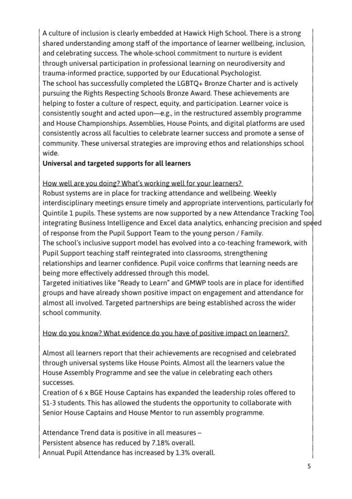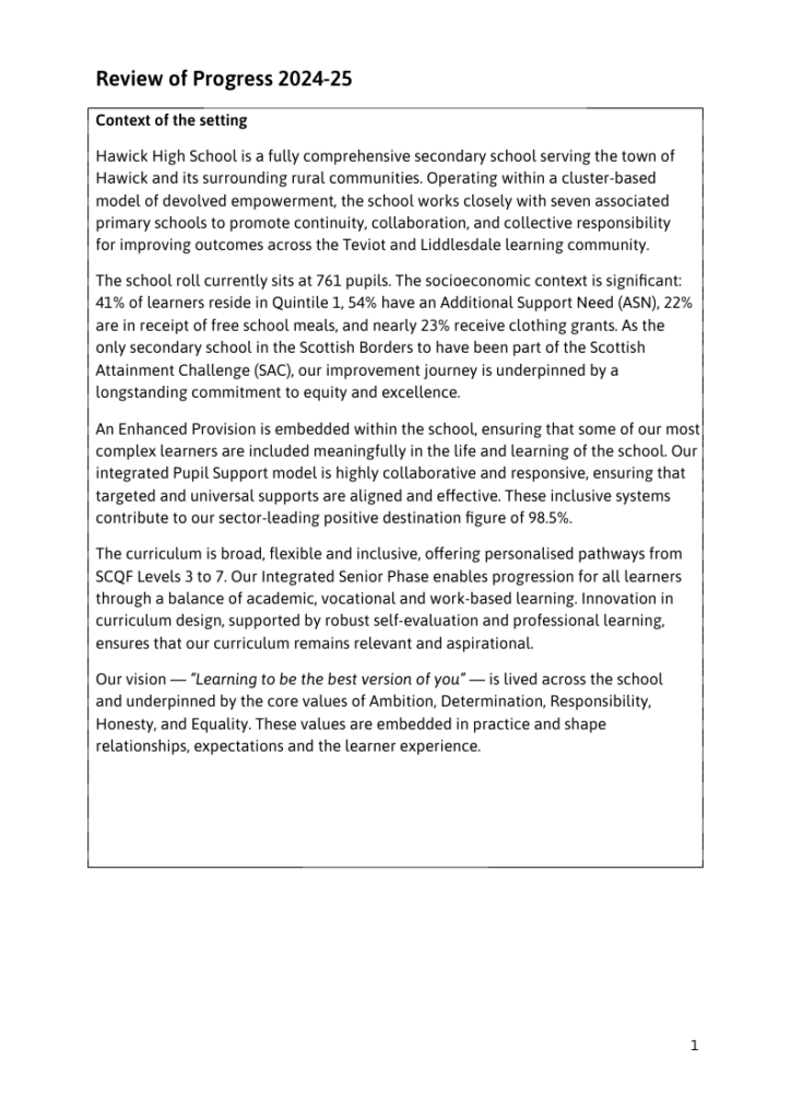 At Hawick High School, we are committed to continuous improvement and providing the best possible learning experiences for all our young people. Our School Improvement Report highlights the progress we have made towards our key priorities and celebrates the achievements of our learners and staff over the past year.