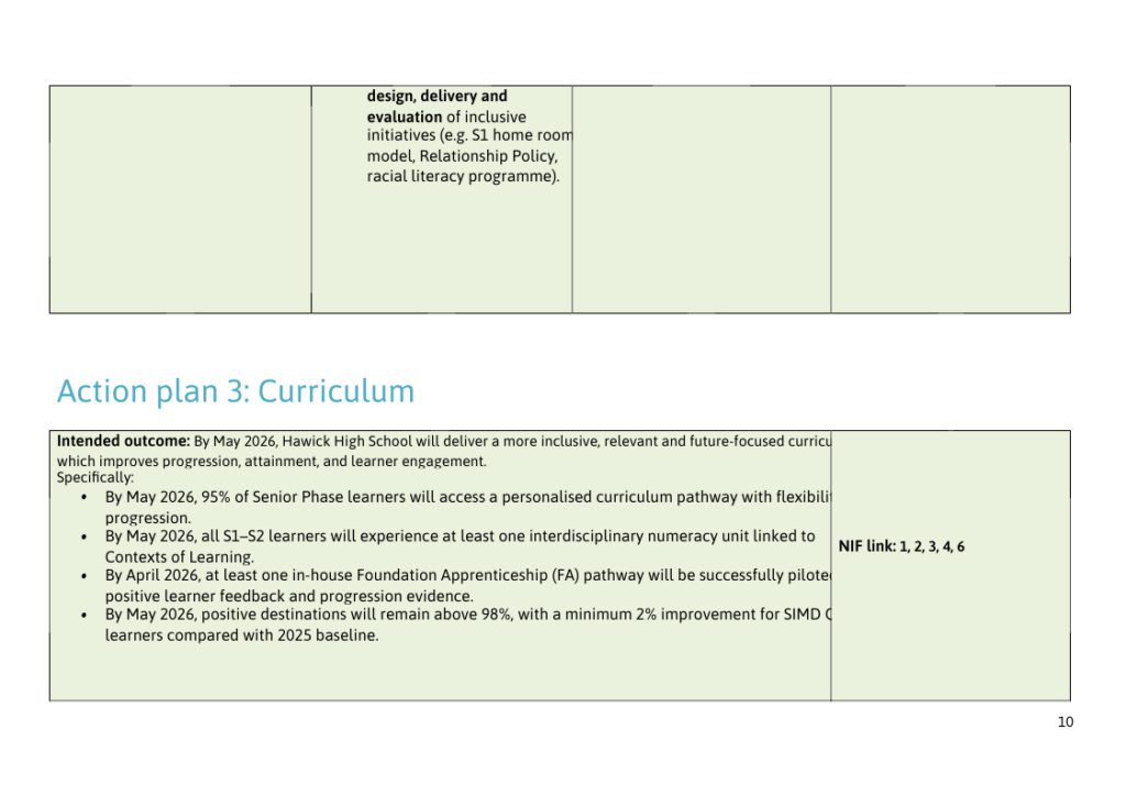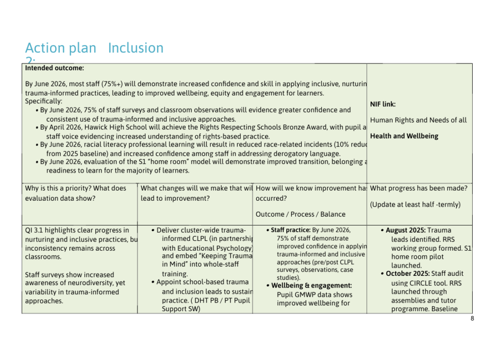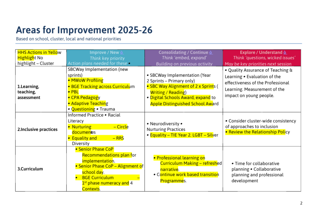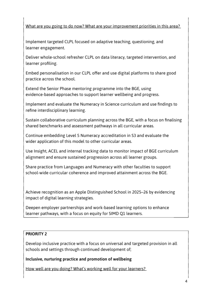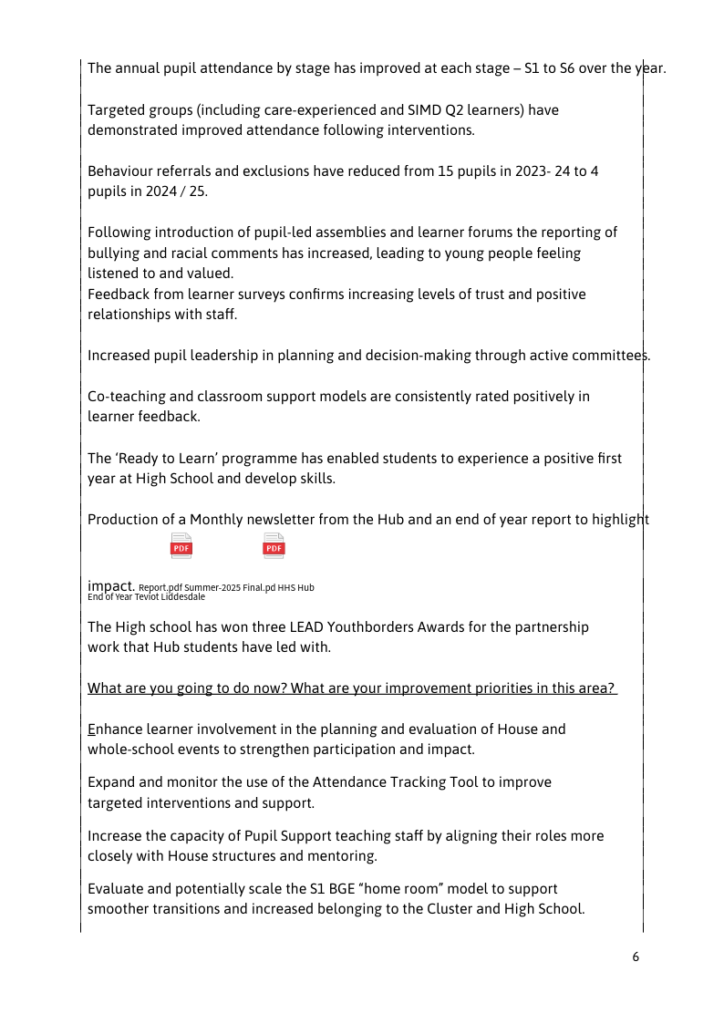 Our School Improvement Plan sets out Hawick High School’s key priorities for the year ahead. It focuses on raising attainment, promoting wellbeing, and ensuring every young person has access to high-quality learning experiences. Working together with our community, we aim to build on our strengths and continue to make Hawick High the best it can be.