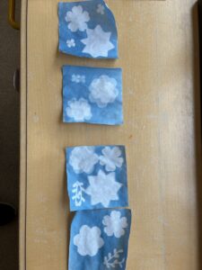 Carole helped us use cyanotype paper that changes colour in the sun to make Mother’s Day cards.