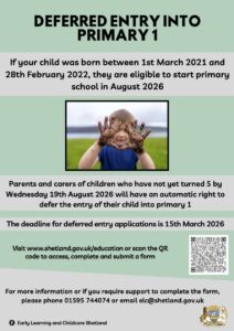 You may defer your child’s entry to Primary 1 if they have not turned five by 19th August 2026. This is an automatic right to defer. To do this, complete the form using the link below by 15th March 2026.