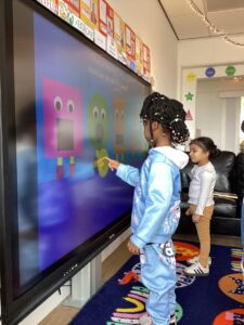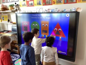 Children enjoyed taking turns to play a shape monster game on the interactive whiteboard. The children had to try and feed the shape monster the matching shapes.