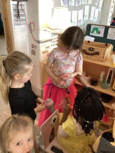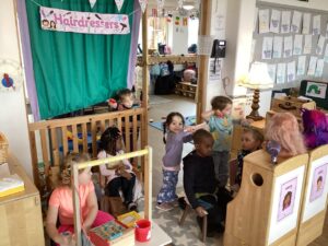 Last term the children chose to create a Tesco shop for the role play area and their second choice was hairdressers. Staff discussed with children if they would still be interested in creating a hairdressers and they were keen. The hairdressers has been really busy this week with children really focused and engaged during play. Children used real life scenarios to inform their role play, working together and sharing the hairdressing resources.