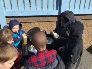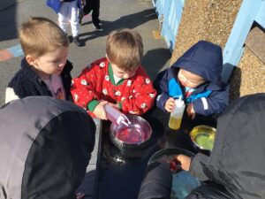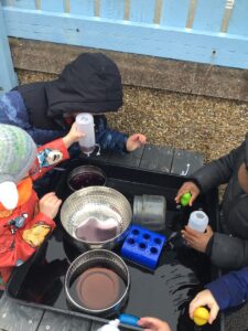 Staff set up a water tray with different coloured water in squeezy bottles, a variety of vessels and some pipettes. Children were supported to learn to squeeze the bottles to release the colours and squeeze the pipettes under the water to fill them and then release before squeezing again to release the liquid. This provided a great learning experience to develop their fine motor skills for pre hand writing.