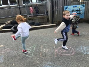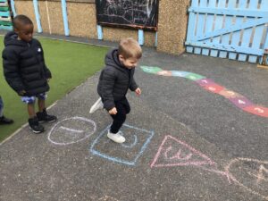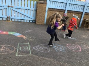 To encourage hopping activities staff began to draw shapes with ascending numbers on the ground outdoors. Staff drew shapes and numbers up to 10 and some children decided to continue this by adding bigger numbers on the end, “11, 12, 13”! Some children copied the numbers and shapes alongside the originals. Staff modelled hopping from one shape/number to another on one foot.