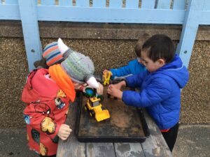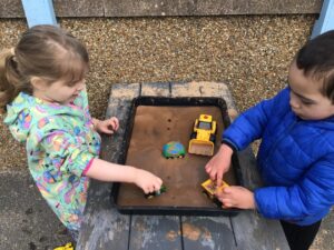 Staff provided a tray of sand and added diggers and cars. The children enjoyed spending time digging in the sand with the vehicles. Children then added water from the mud kitchen so the following day staff set up a tray again but this time added half water and half sand.