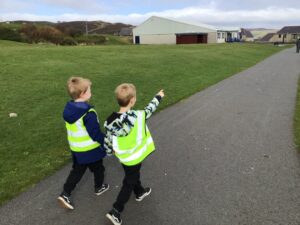 “Square, the sign is square, it’s got 4 sides”. “No, it’s a rectangle”. “Love hearts in the window”. “Circle, wheels”. “Semi-circles on the wall”. “Triangle in the grass, it has 3 sides”.