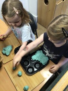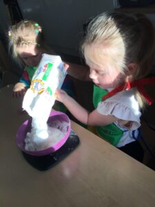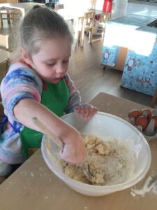 The children helped to identify the ingredients needed to make playdough for Nursery.  They used their knowledge of numbers to identify the number of cups needed for each item in the recipe.  Each child taking part took turns and used their listening skills.  They measured with spoons and cups, adding the correct ingredients and mixing together.