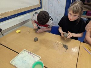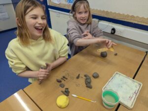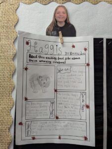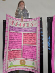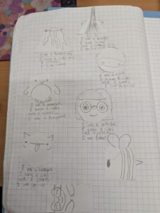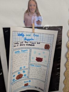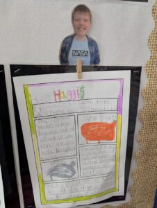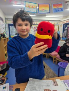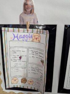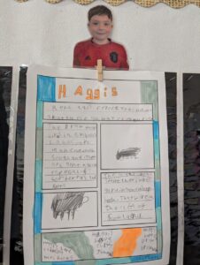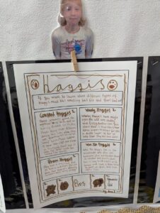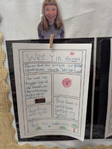 Haggis themed fun. We watched a mockumentary about the wild haggis of Scotland. We learned about the Irn bru haggis, the Mullet Haggis, the Woolly Haggis and many more. After we made fact files about a haggis of our choice. On Thursday we made clay sculptures of many different haggis. Mine is called “The long neck tiny face stubby legs haggis.”