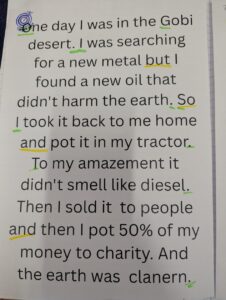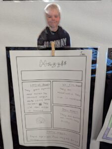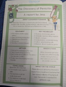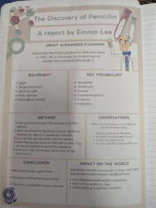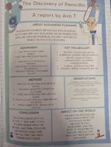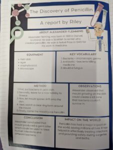 Writing – Alexander Fleming. We did our writing stimulus about Alexander Fleming and he discovered Penicillin after taking a vacay. We wrote our own amazing discovery stories and scientific reports. We wrote the reports step by step with Mrs A which was really clear and helpful to guide us to know what to do for each part. We were given a topic and time to write about that specifically which helped to us all to keep on track. It was good and we want to do more lessons like that. Here are some samples of the writing from our class this week.