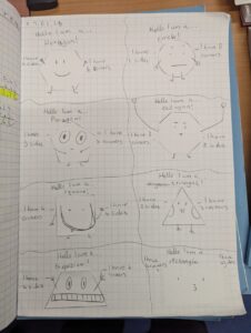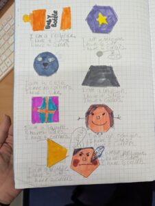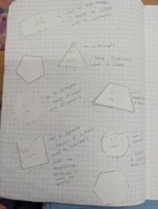 Maths – Shape. For maths, we have been working on 2D shapes and their properties and also angles and lines. We created 2D shape characters and played Blooket to practice our facts about different kinds of angles and types of line.