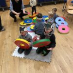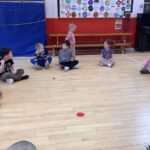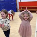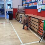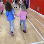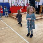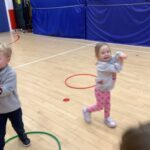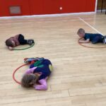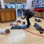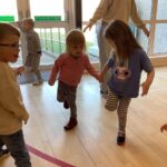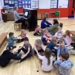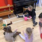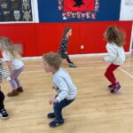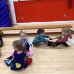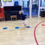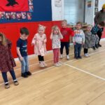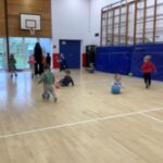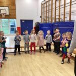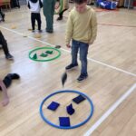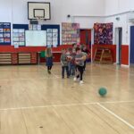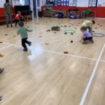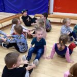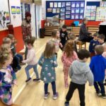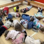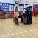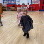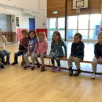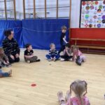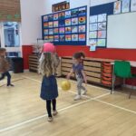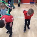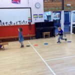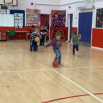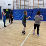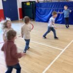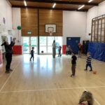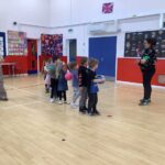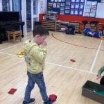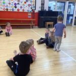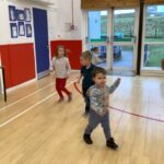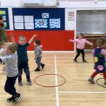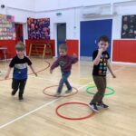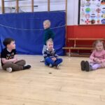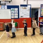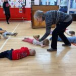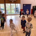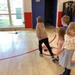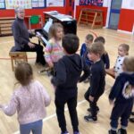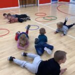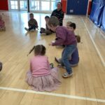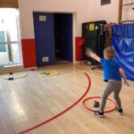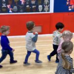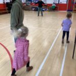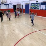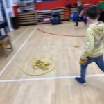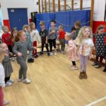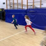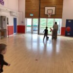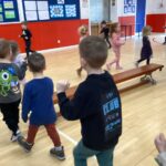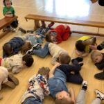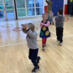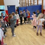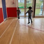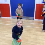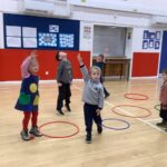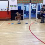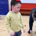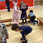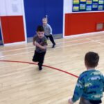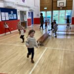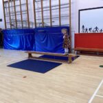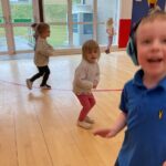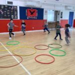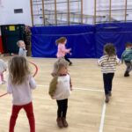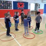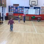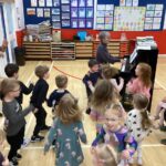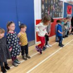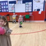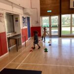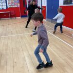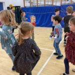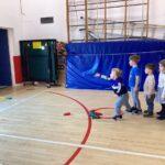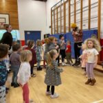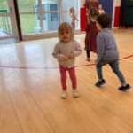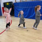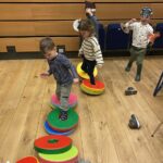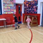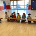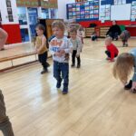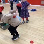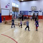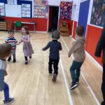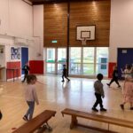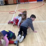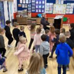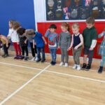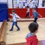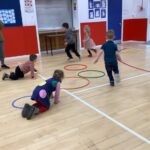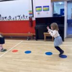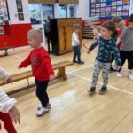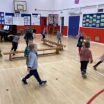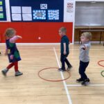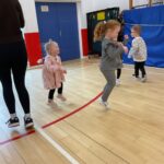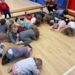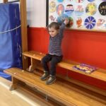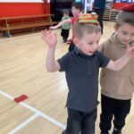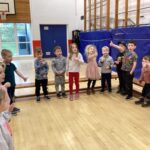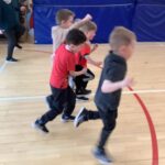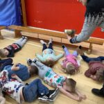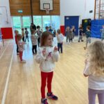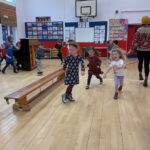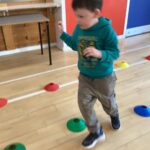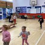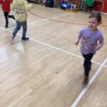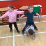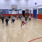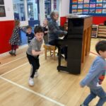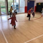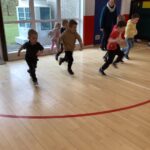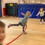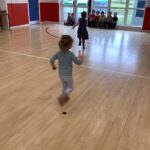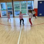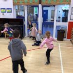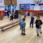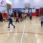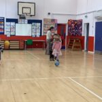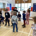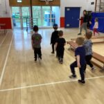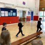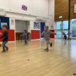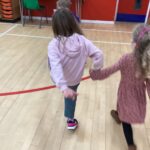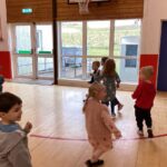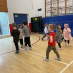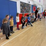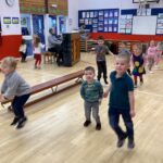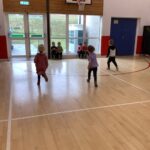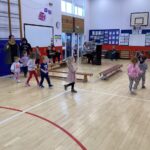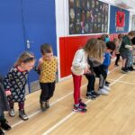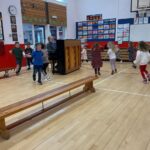 Mrs Garrick introduced a new pitch and movement exercise this week during music. The bairns lined up on the white line at the edge of the hall. When the notes from the piano were low, they stayed on this line. When Mrs Garrick played high notes, they jumped forward to the next white line.