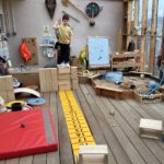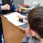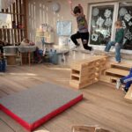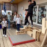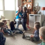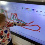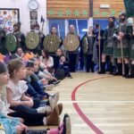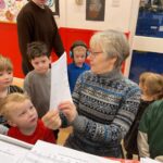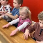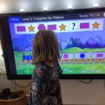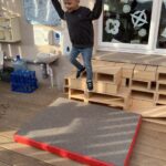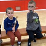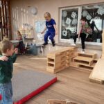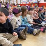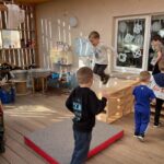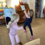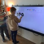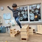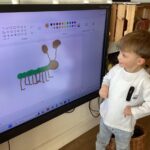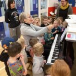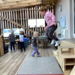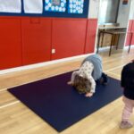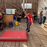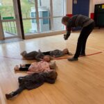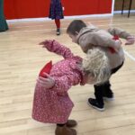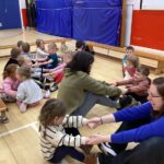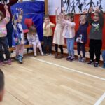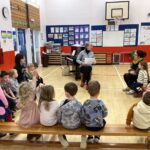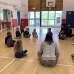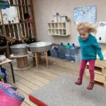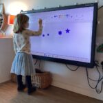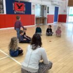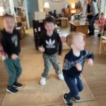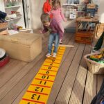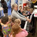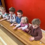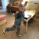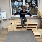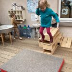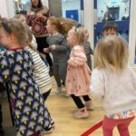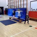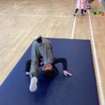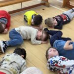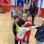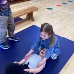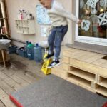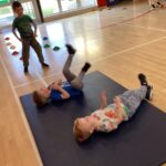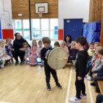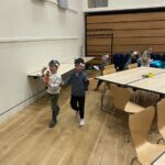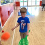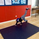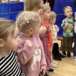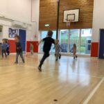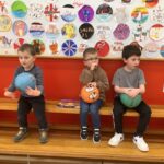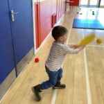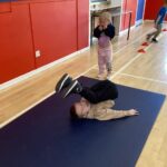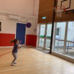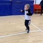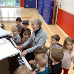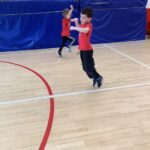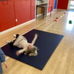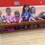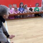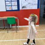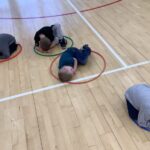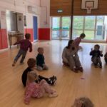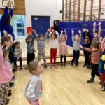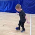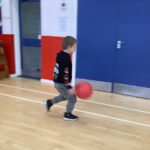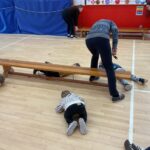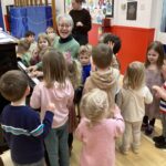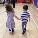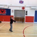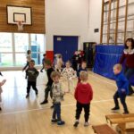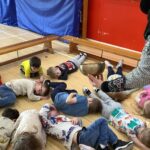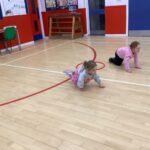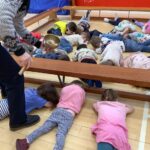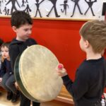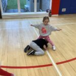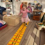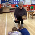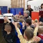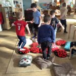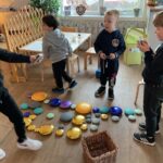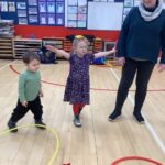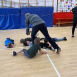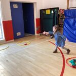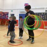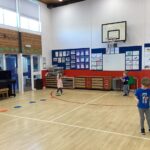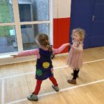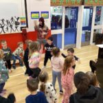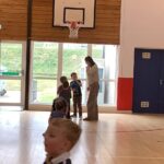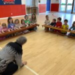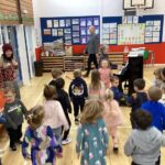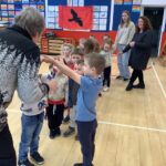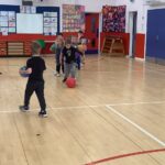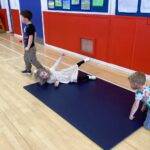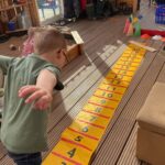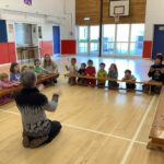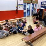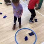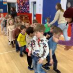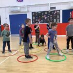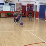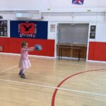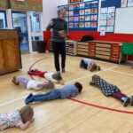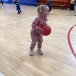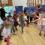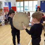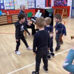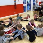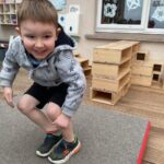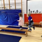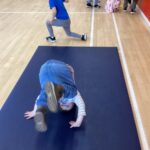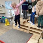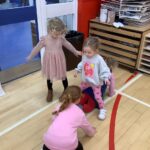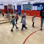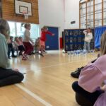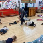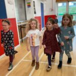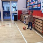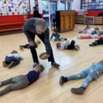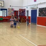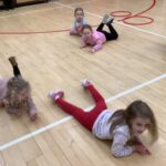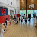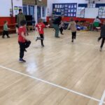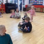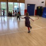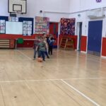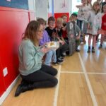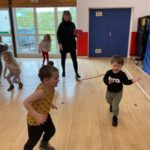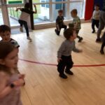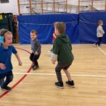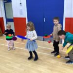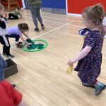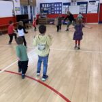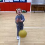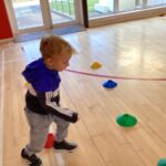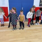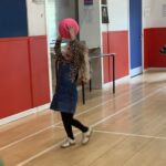 Mrs Garrick introduced a new pitch and movement exercise this week during music. The bairns lined up on the white line at the edge of the hall. When the notes from the piano were low, they stayed on this line. When Mrs Garrick played high notes, they jumped forward to the next white line.