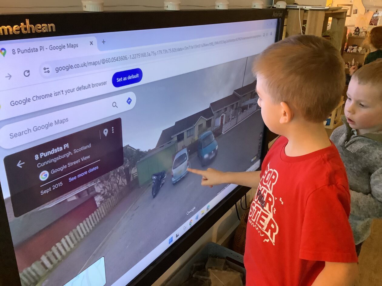 Using Google Street View to find where they, family members, and friends live has been a focus this week and a valuable opportunity to model and use directional language and demonstrate a knowledge of the local community and beyond. The bairns used the nursery as a starting point to find their homes, using familiar landmarks to guide them in the right direction. One of the road trips had a pit stop to Tesco to buy some sausages.