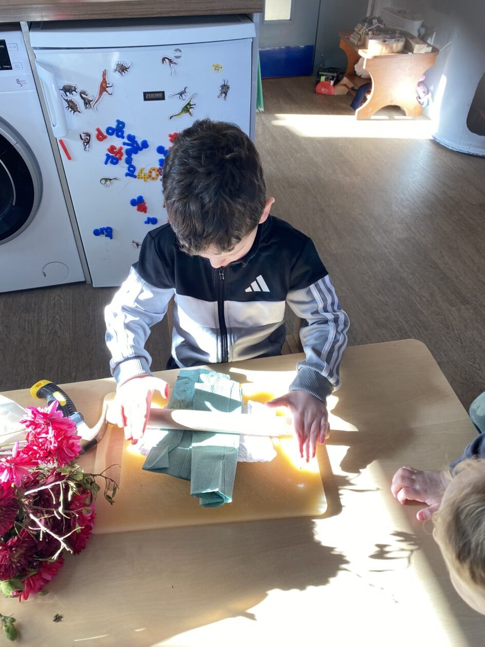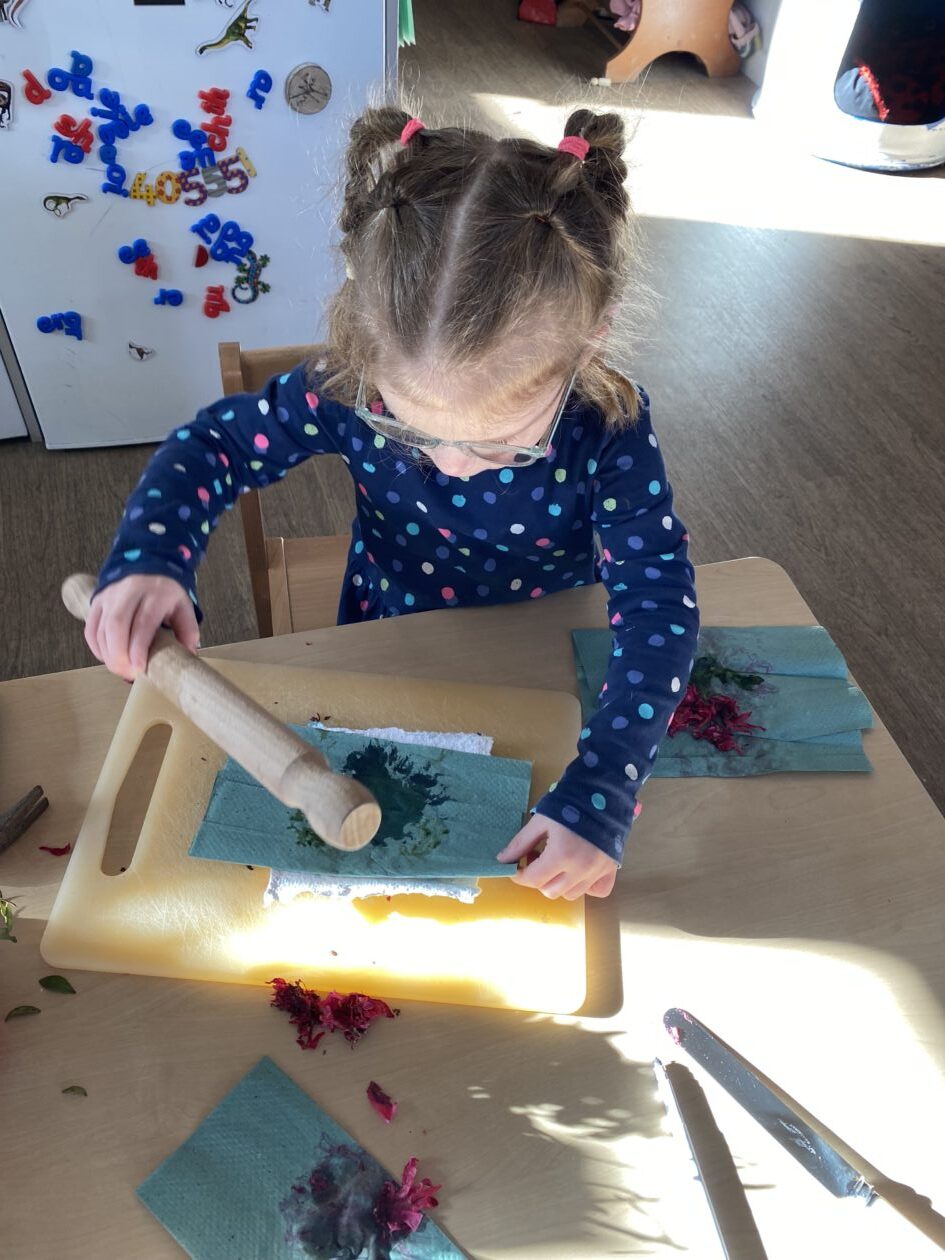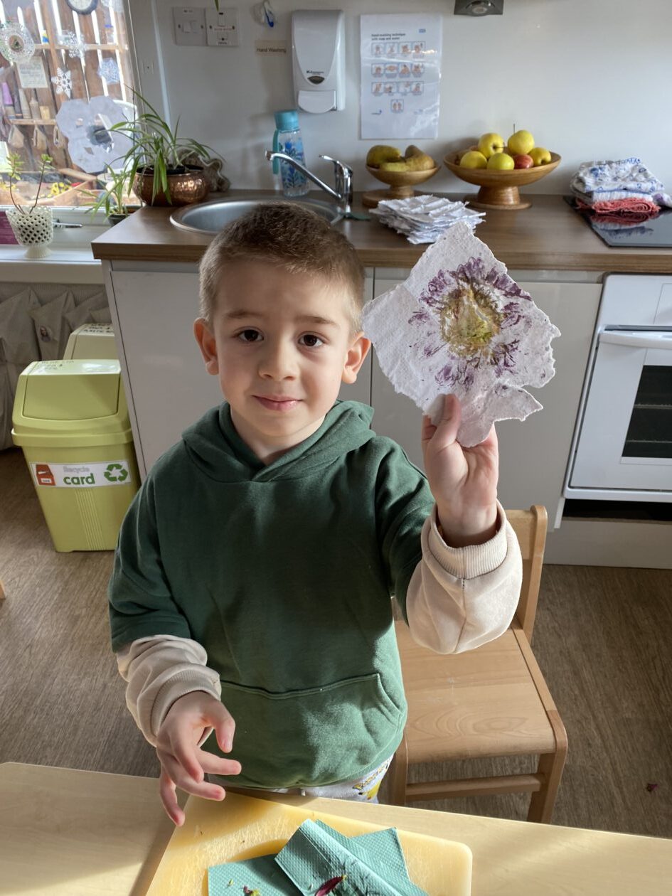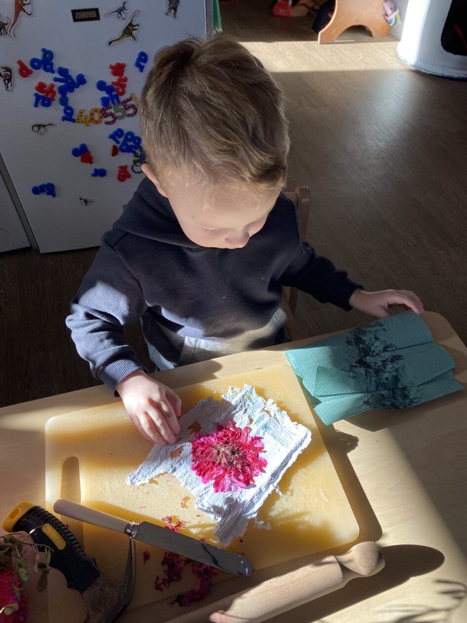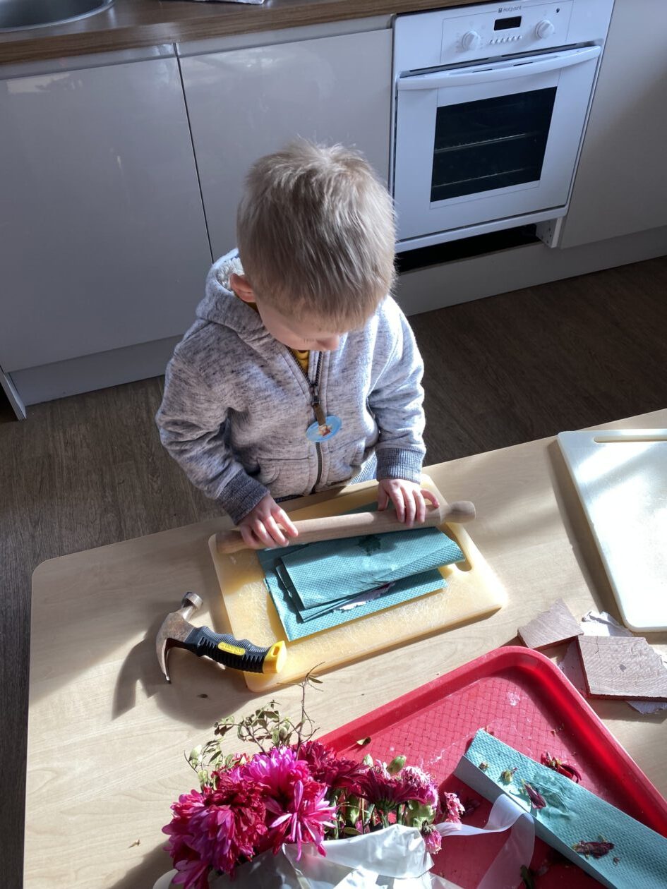 The paper making was a success! The bairns were very excited to see if the pulp had dried and carefully pulled it away from the cloths trying not to tear it. They found some leaves from the garden and fading valentines day flowers for printing using the hammers and rolling pins to see if the colours would come on to their paper. ‘The pink is there and my flower is squishy now.’ We explored the differences between hitting harder and softer with the hammer and how the colours were different because of this.