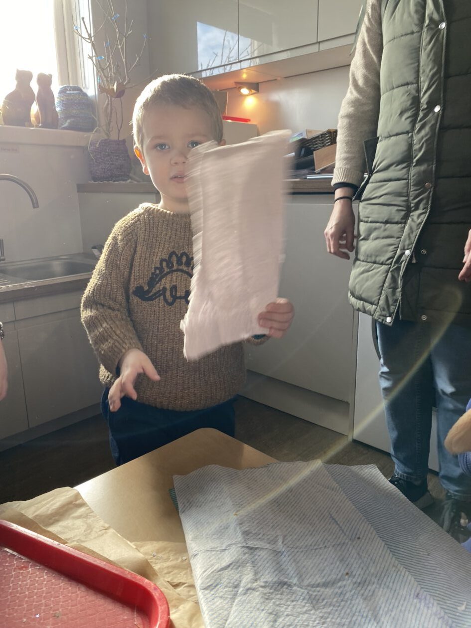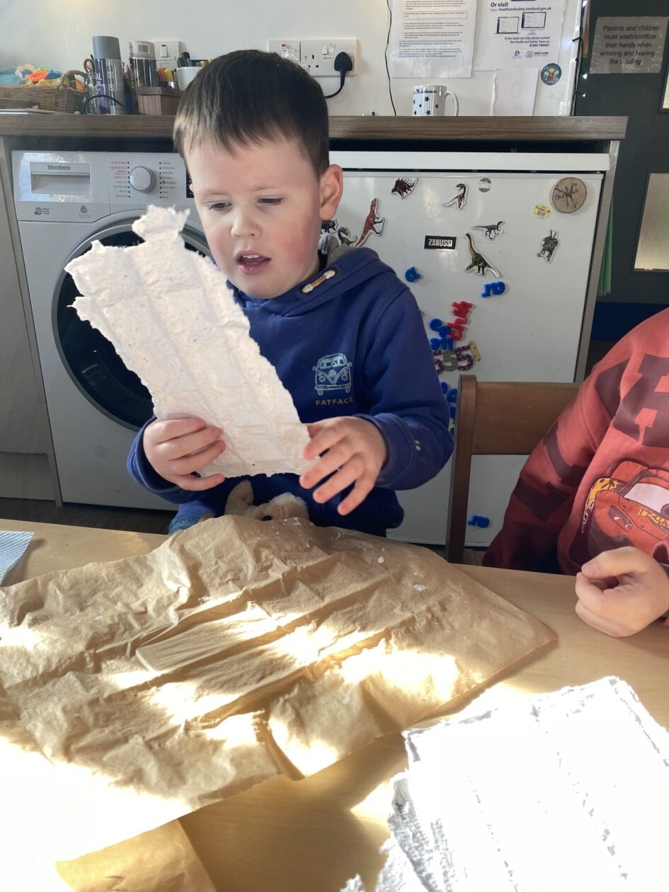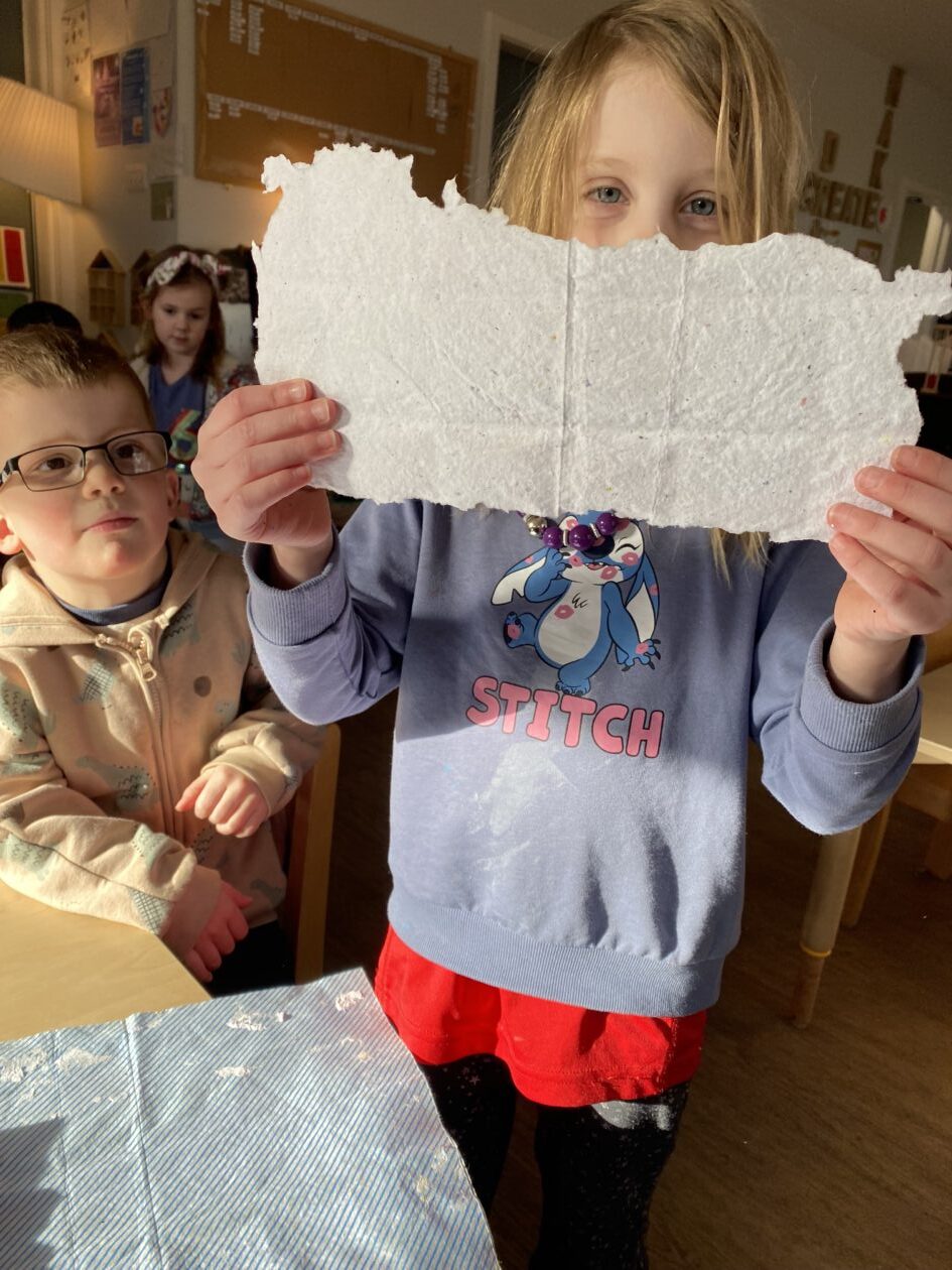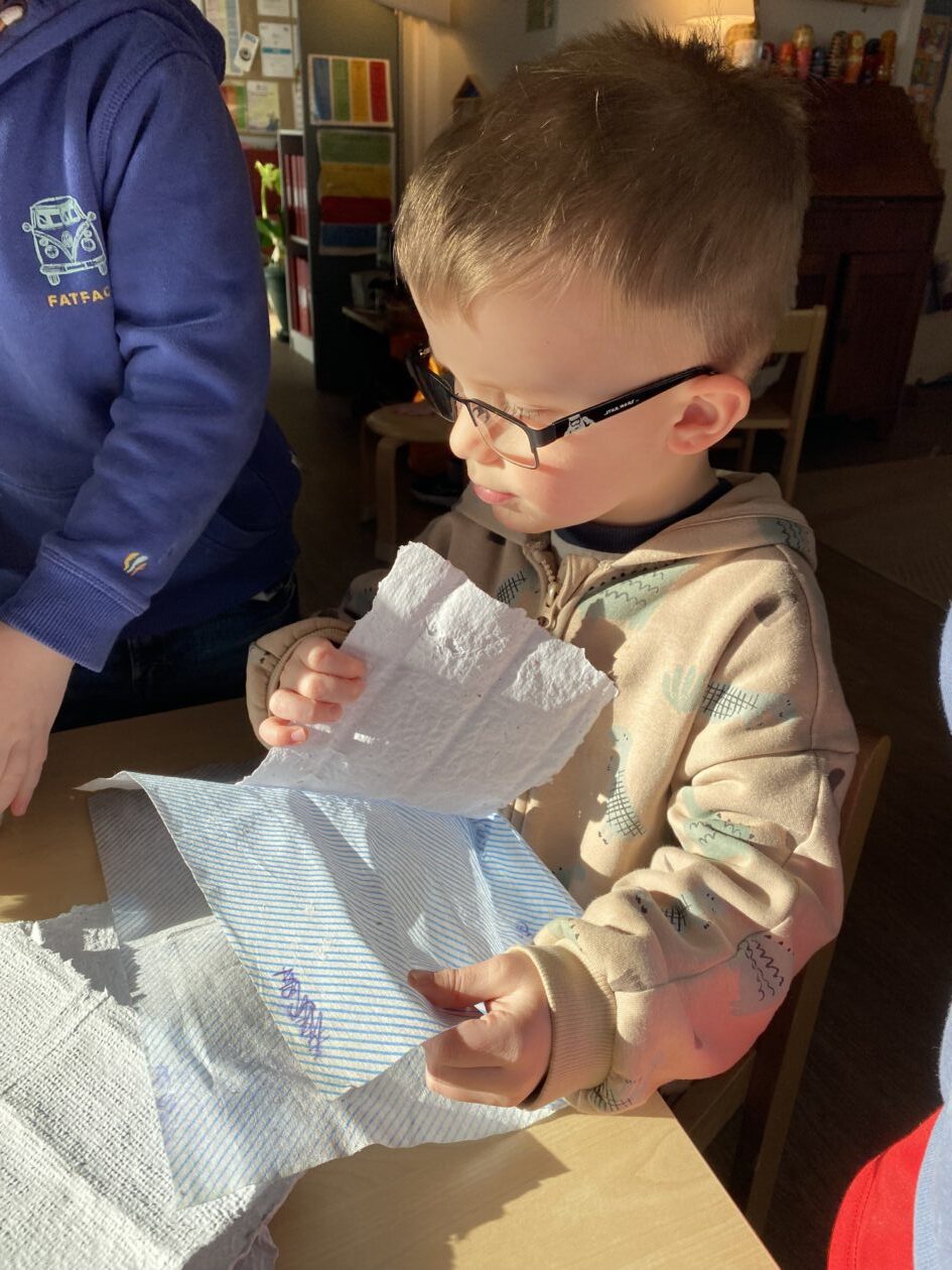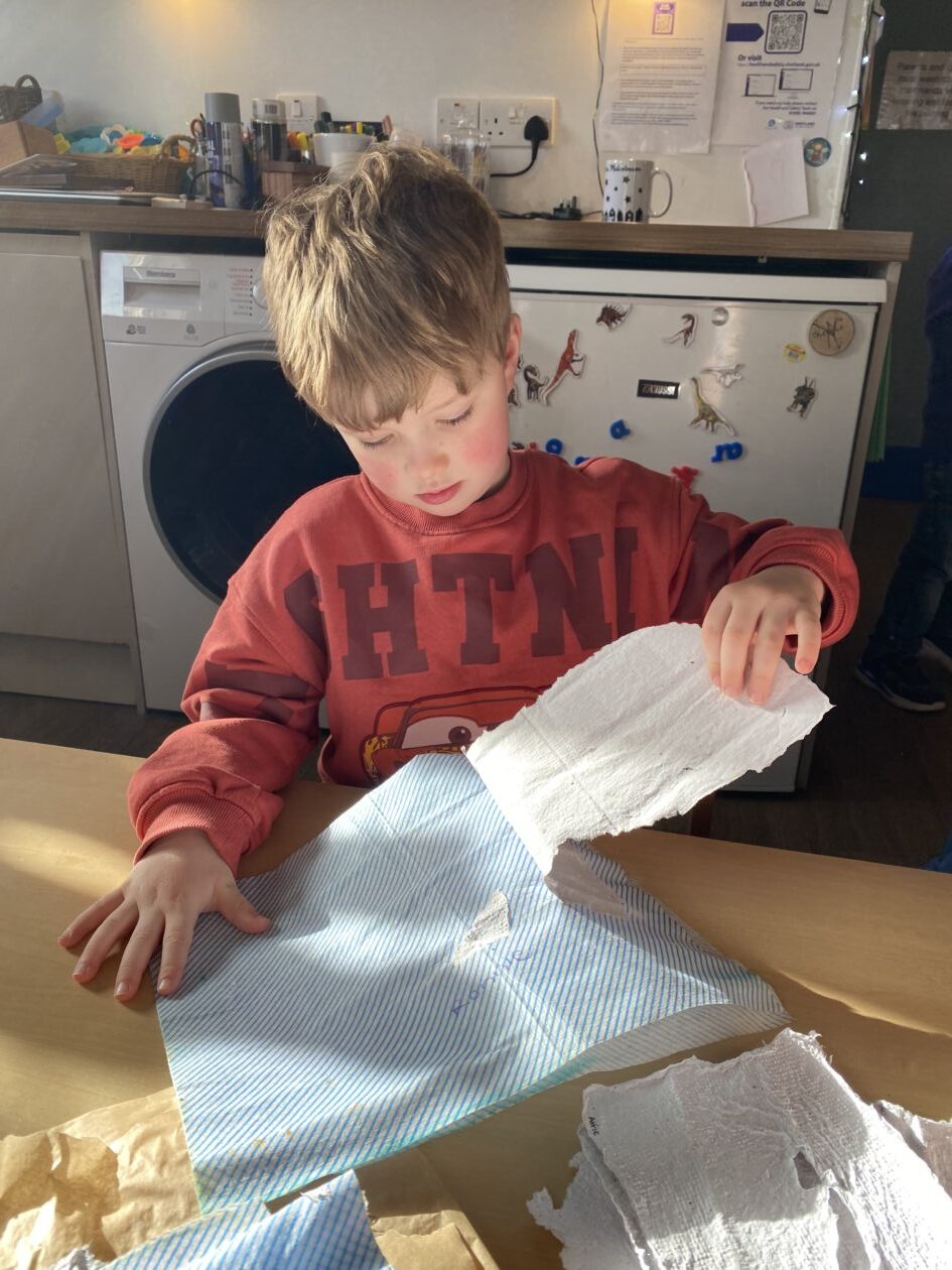 The paper making was a success! The bairns were very excited to see if the pulp had dried and carefully pulled it away from the cloths trying not to tear it. They found some leaves from the garden and fading valentines day flowers for printing using the hammers and rolling pins to see if the colours would come on to their paper. ‘The pink is there and my flower is squishy now.’ We explored the differences between hitting harder and softer with the hammer and how the colours were different because of this.