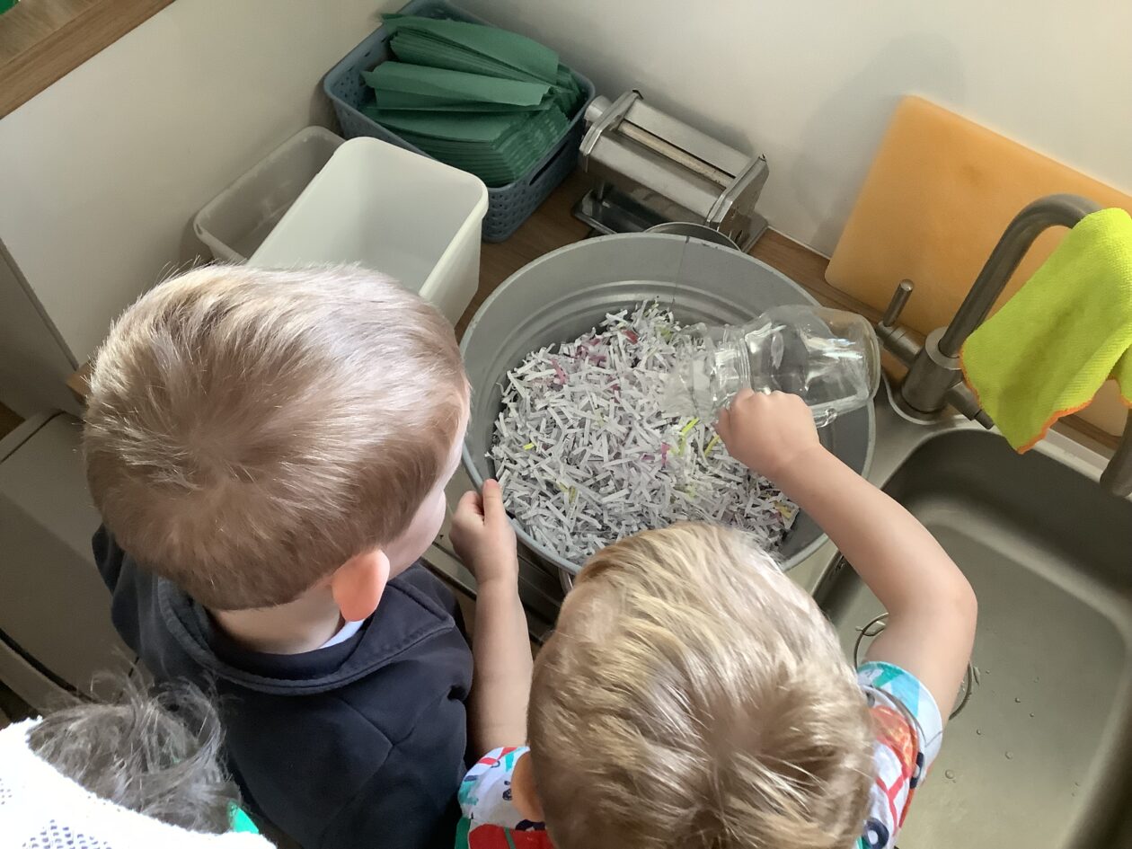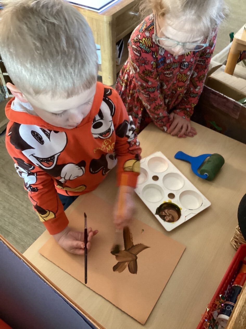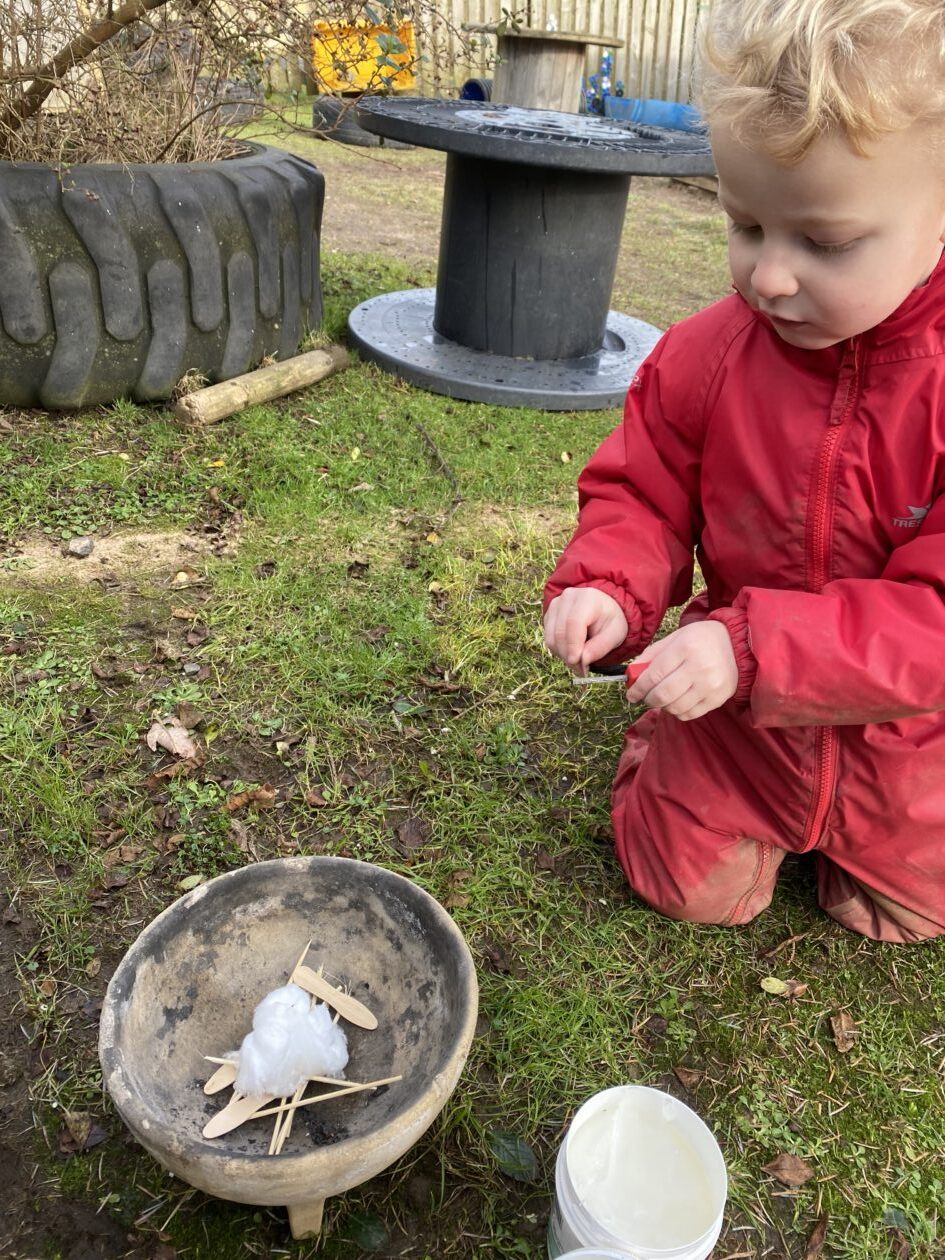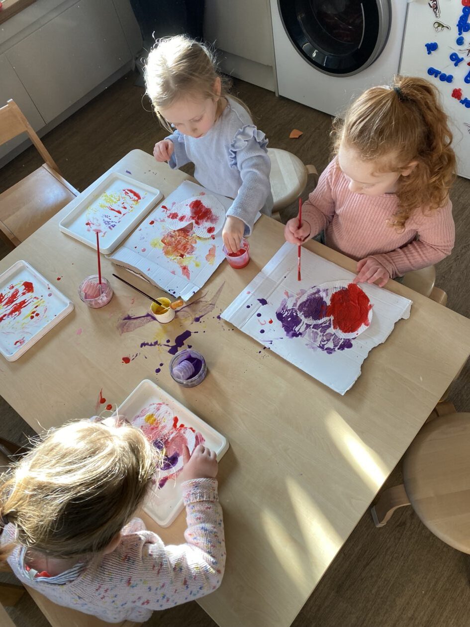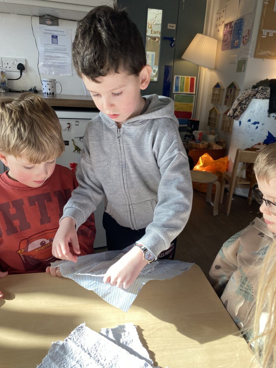 The paper making was a success! The bairns were very excited to see if the pulp had dried and carefully pulled it away from the cloths trying not to tear it. They found some leaves from the garden and fading valentines day flowers for printing using the hammers and rolling pins to see if the colours would come on to their paper. ‘The pink is there and my flower is squishy now.’ We explored the differences between hitting harder and softer with the hammer and how the colours were different because of this.