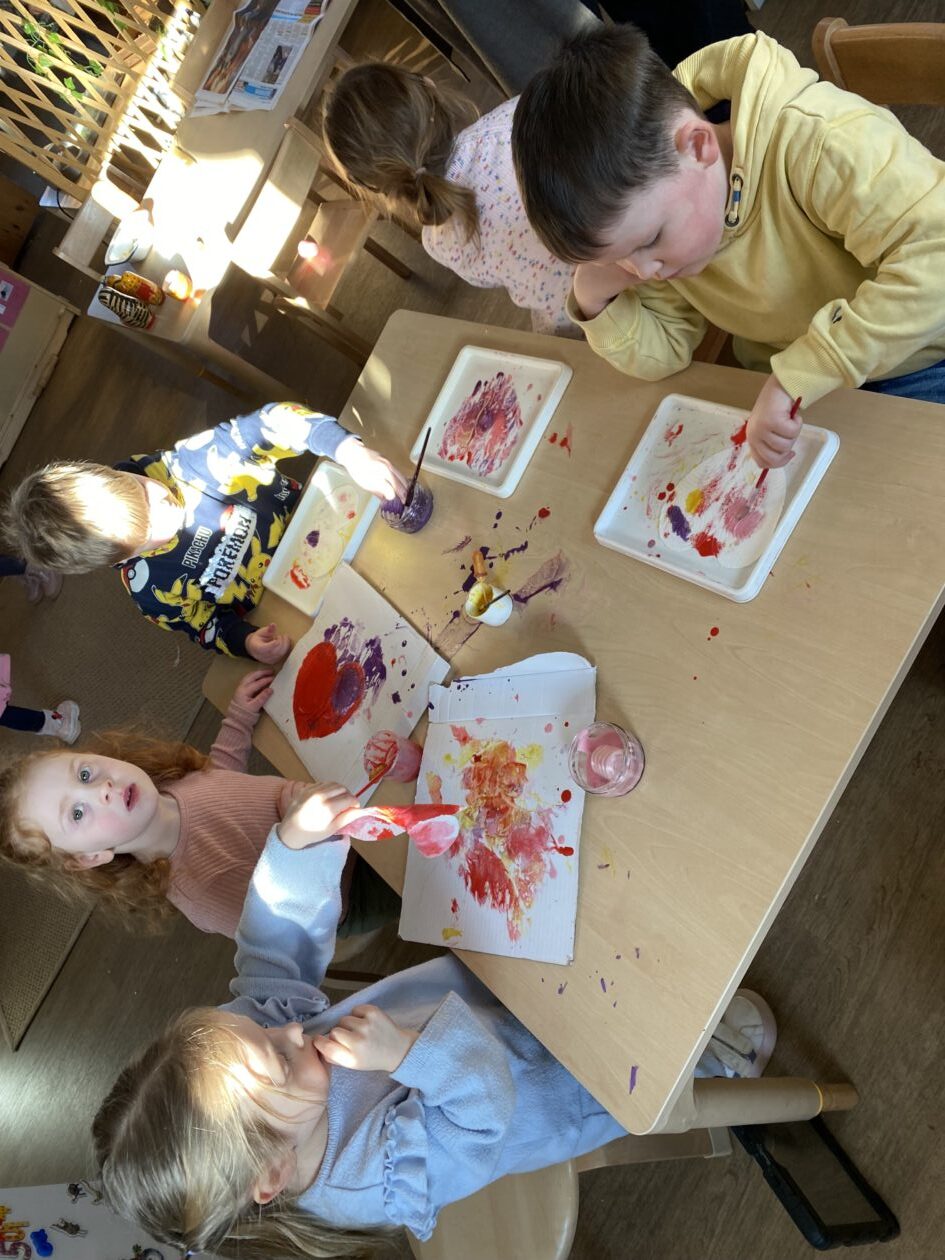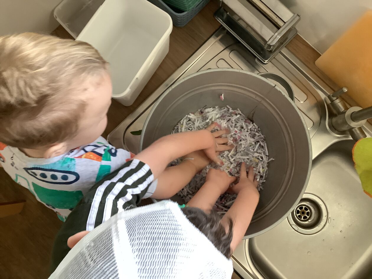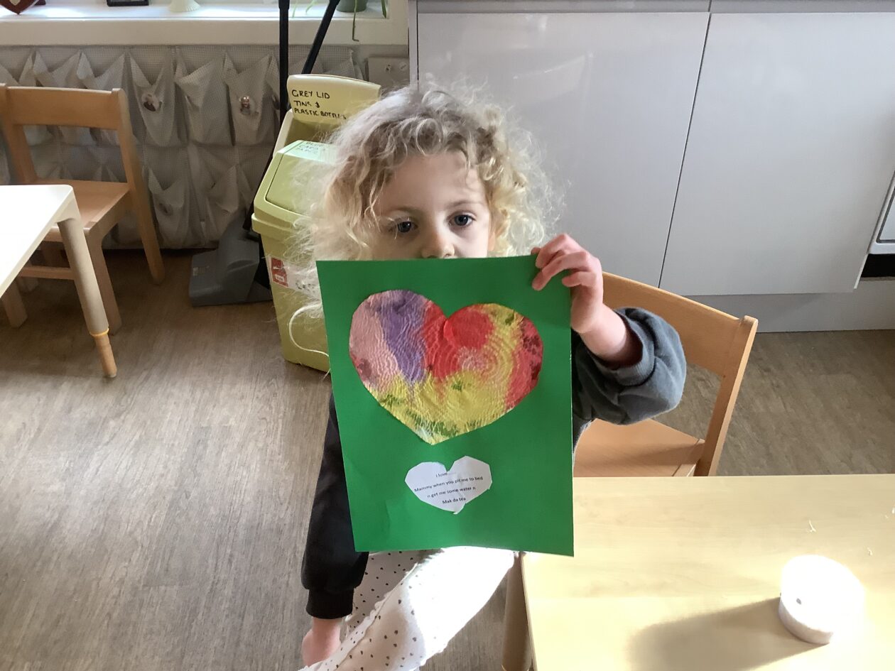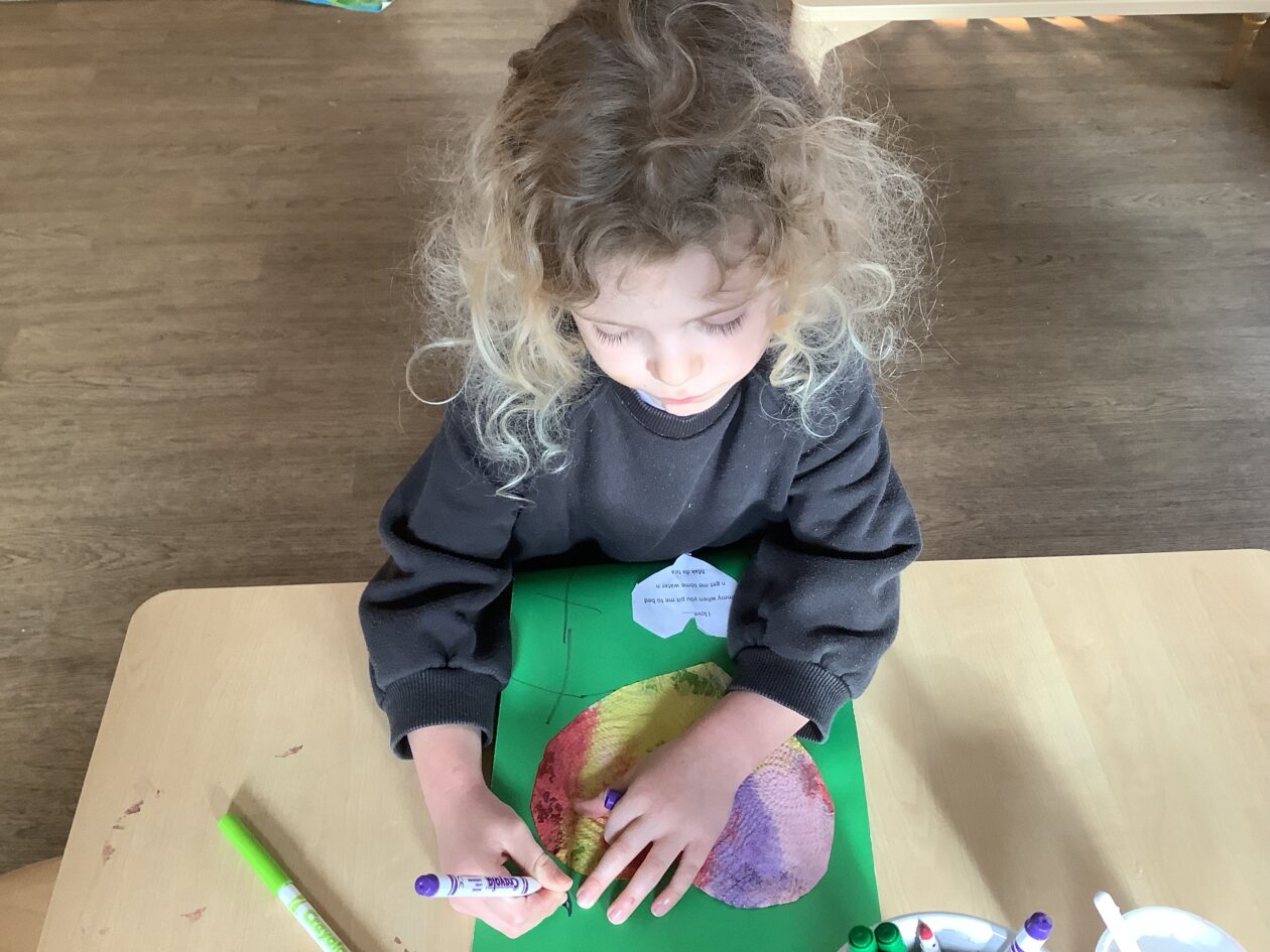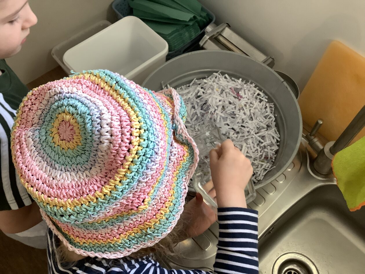 The paper making was a success! The bairns were very excited to see if the pulp had dried and carefully pulled it away from the cloths trying not to tear it. They found some leaves from the garden and fading valentines day flowers for printing using the hammers and rolling pins to see if the colours would come on to their paper. ‘The pink is there and my flower is squishy now.’ We explored the differences between hitting harder and softer with the hammer and how the colours were different because of this.