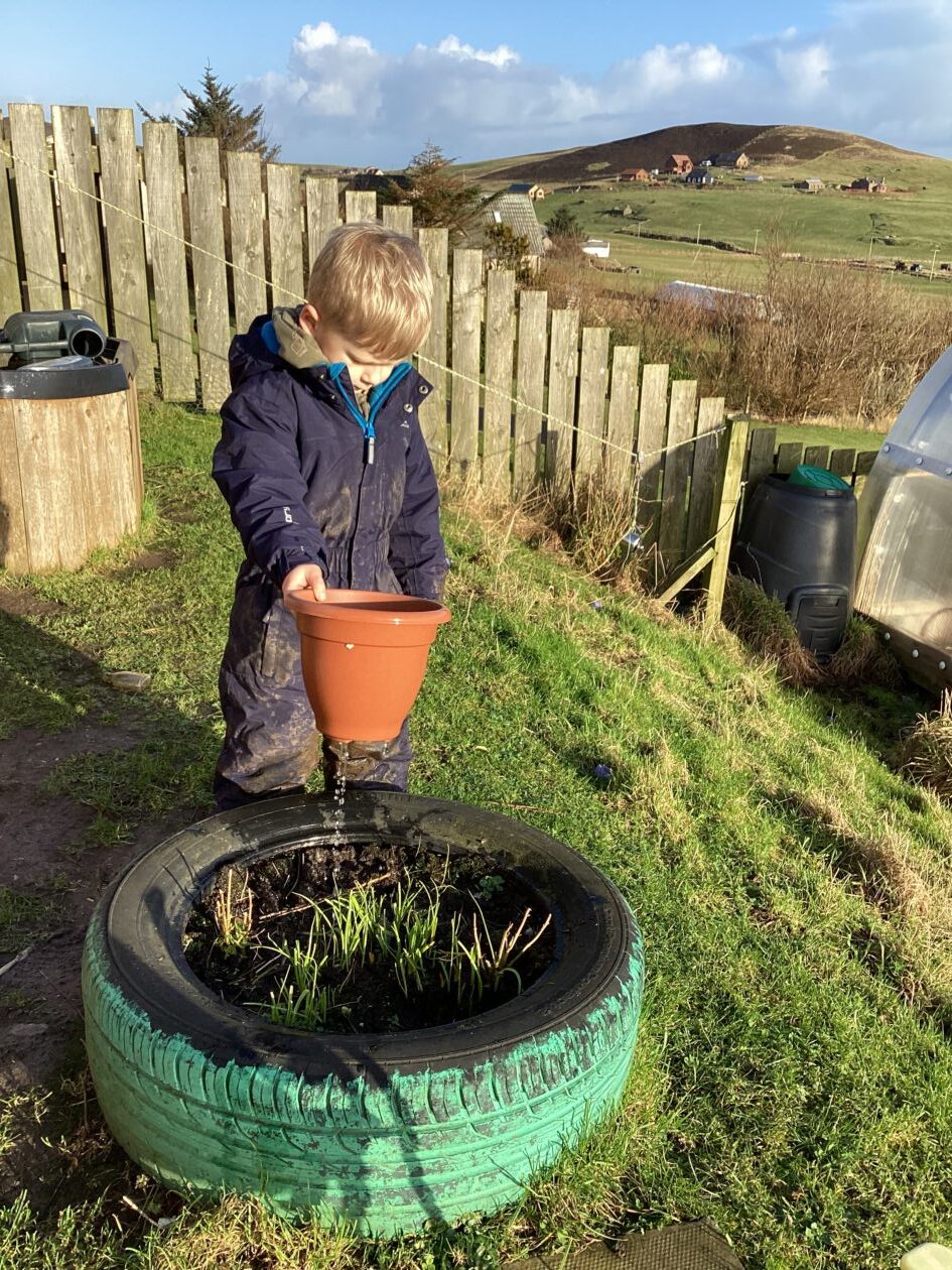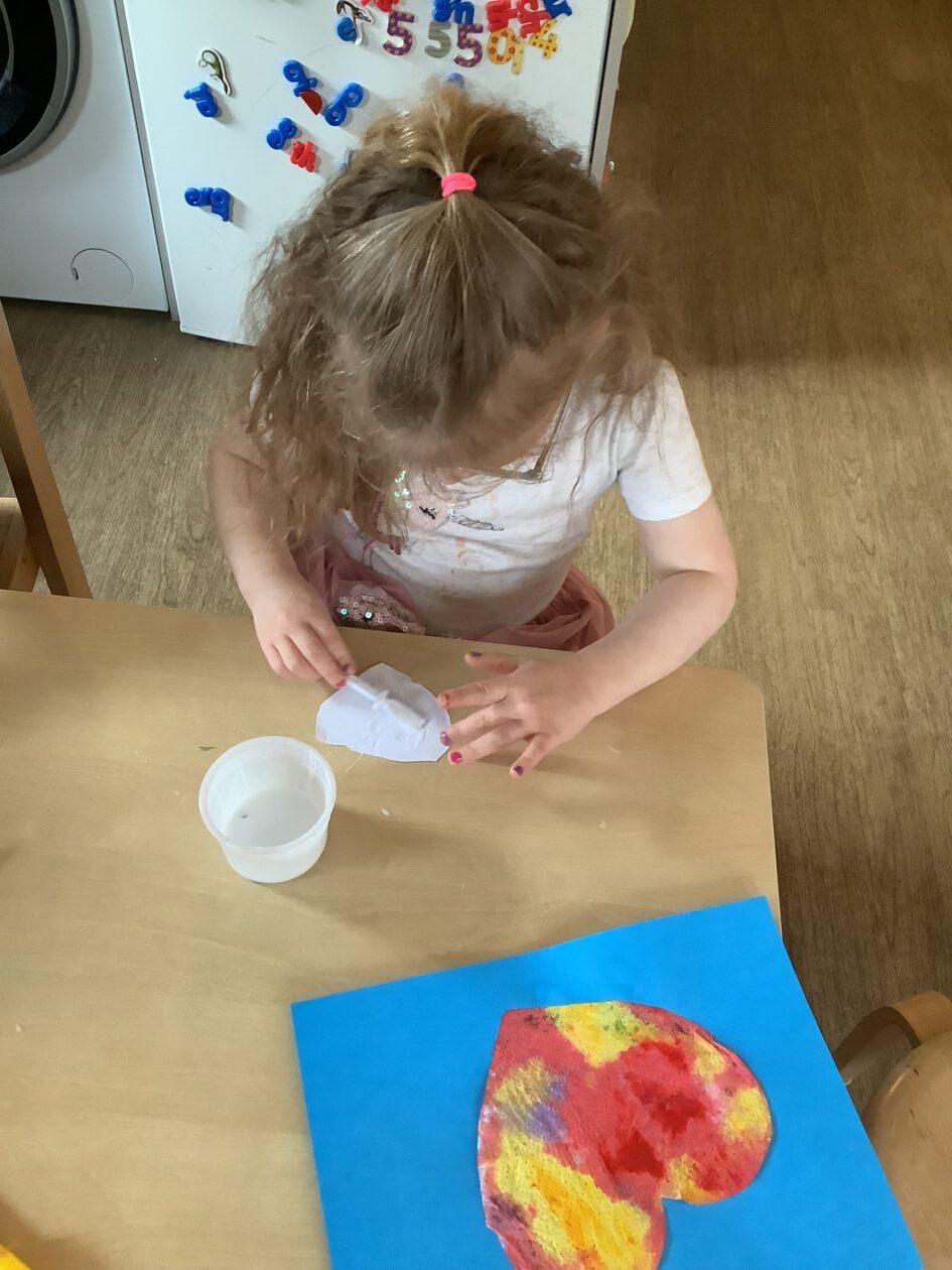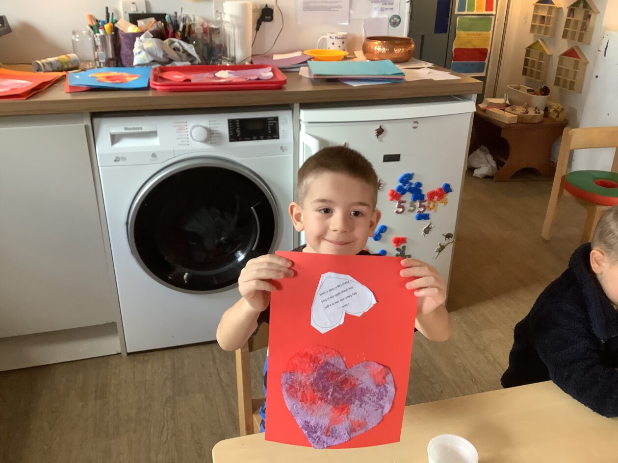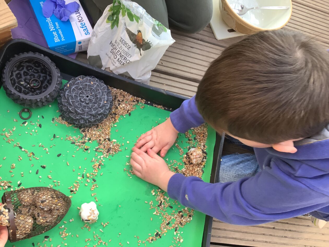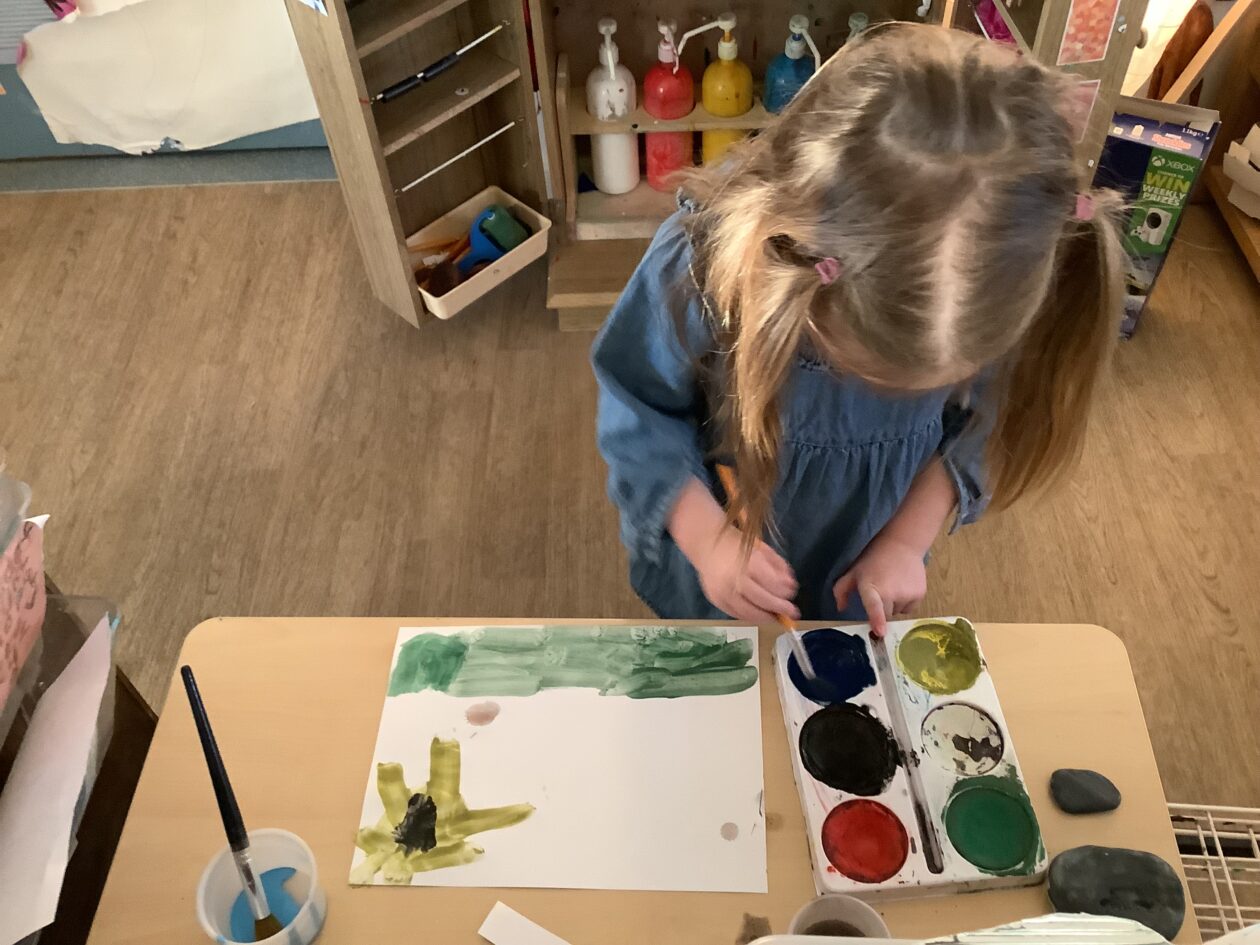 The paper making was a success! The bairns were very excited to see if the pulp had dried and carefully pulled it away from the cloths trying not to tear it. They found some leaves from the garden and fading valentines day flowers for printing using the hammers and rolling pins to see if the colours would come on to their paper. ‘The pink is there and my flower is squishy now.’ We explored the differences between hitting harder and softer with the hammer and how the colours were different because of this.