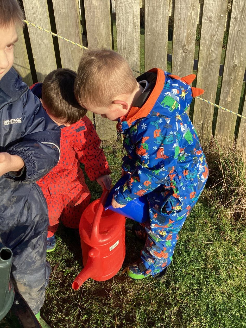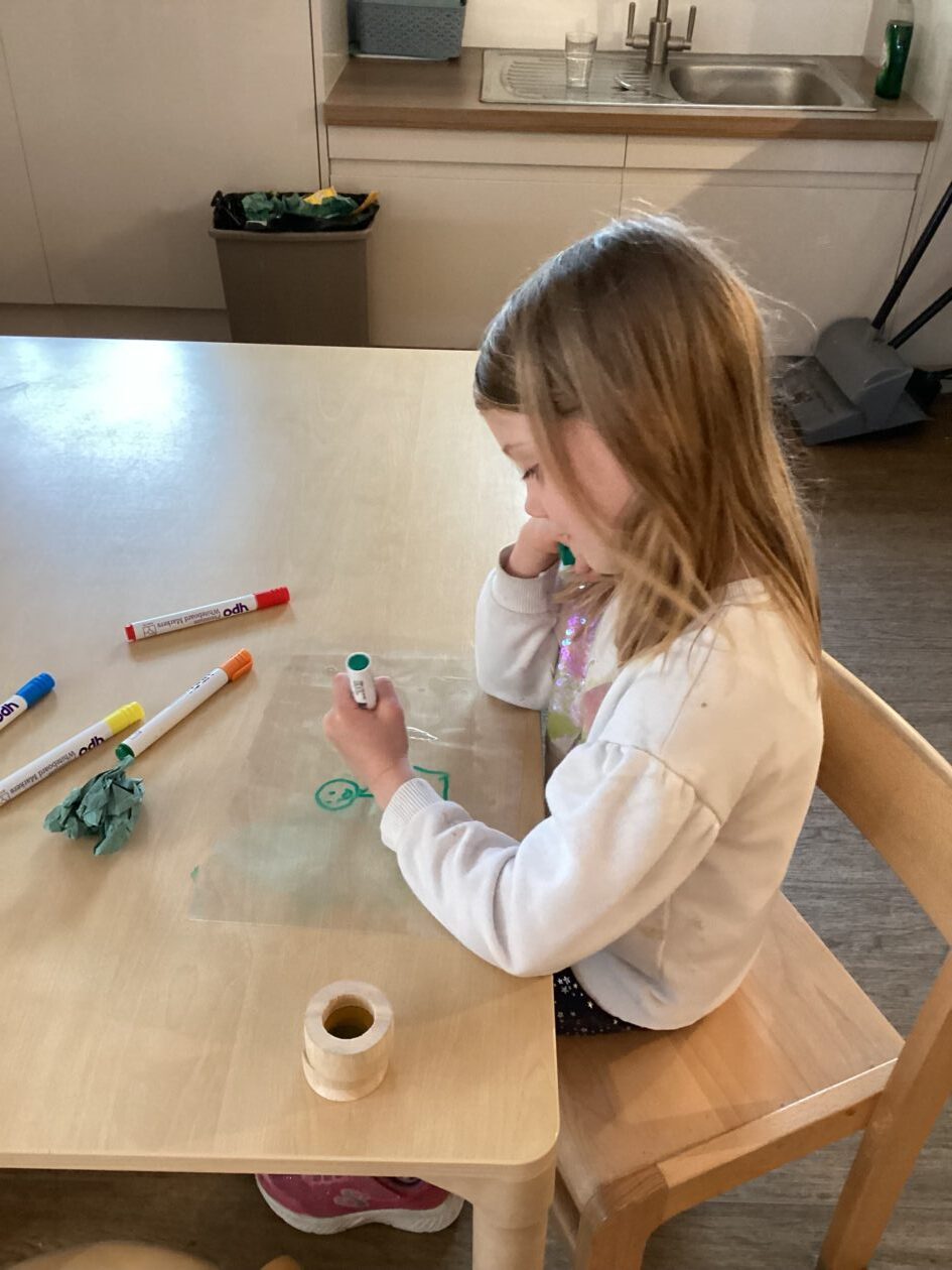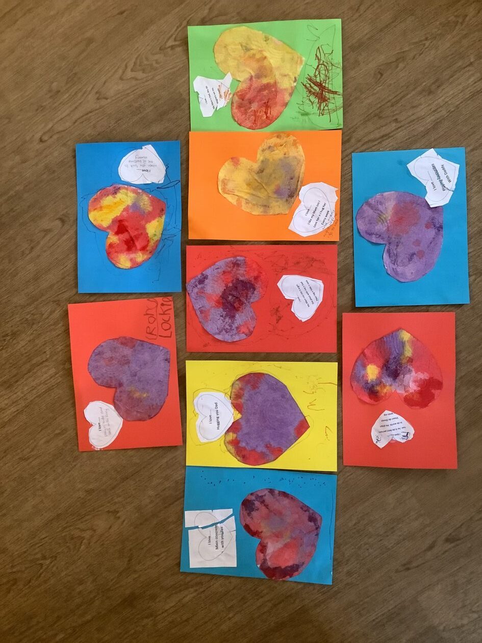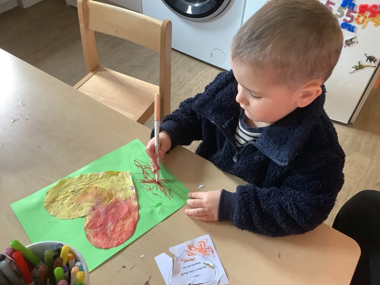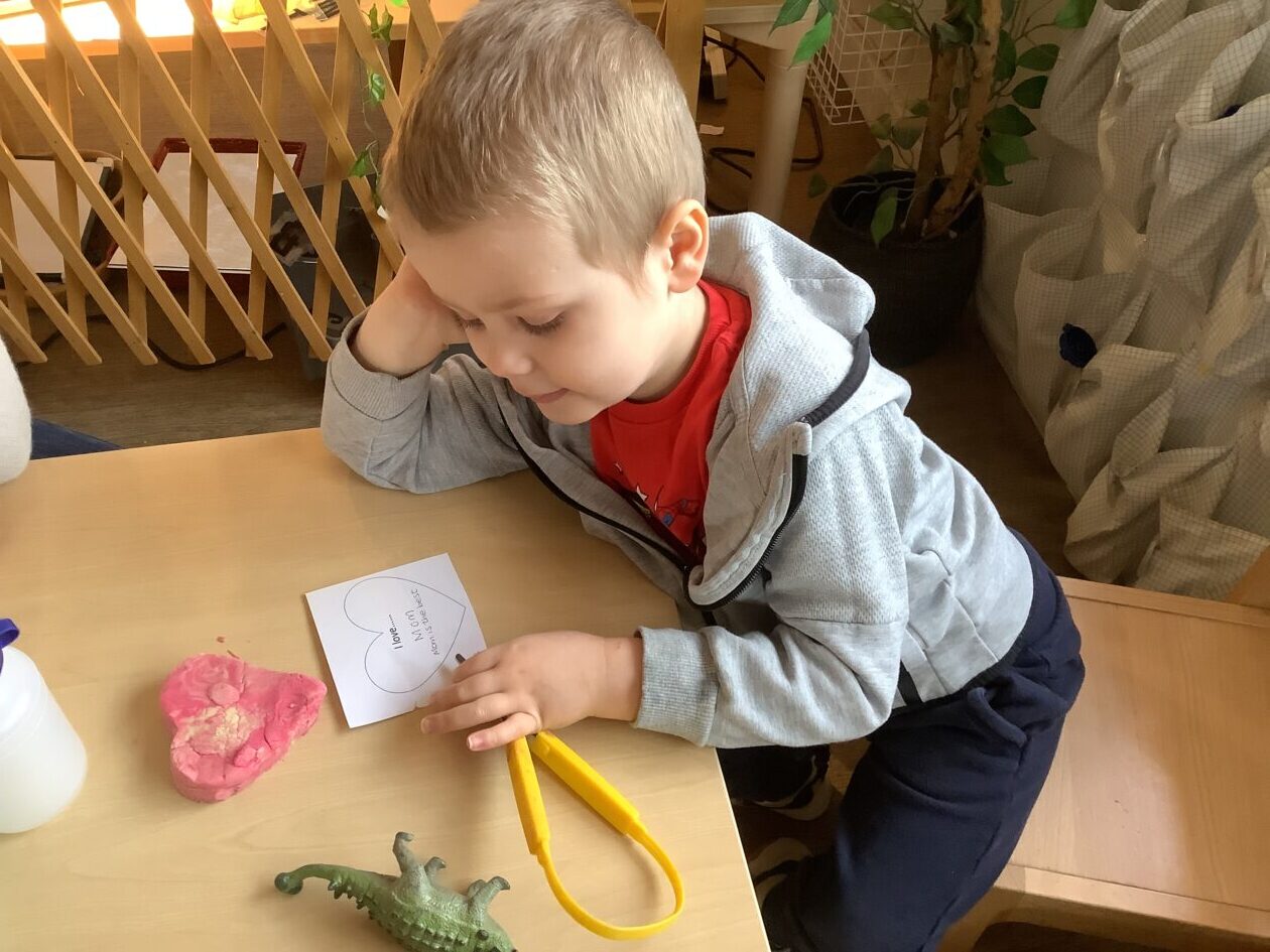 The paper making was a success! The bairns were very excited to see if the pulp had dried and carefully pulled it away from the cloths trying not to tear it. They found some leaves from the garden and fading valentines day flowers for printing using the hammers and rolling pins to see if the colours would come on to their paper. ‘The pink is there and my flower is squishy now.’ We explored the differences between hitting harder and softer with the hammer and how the colours were different because of this.