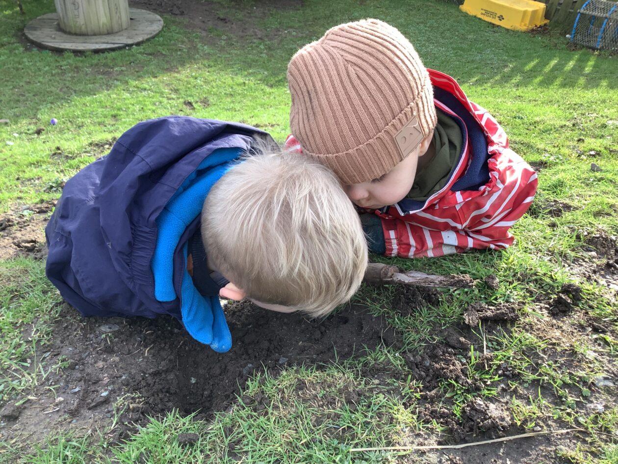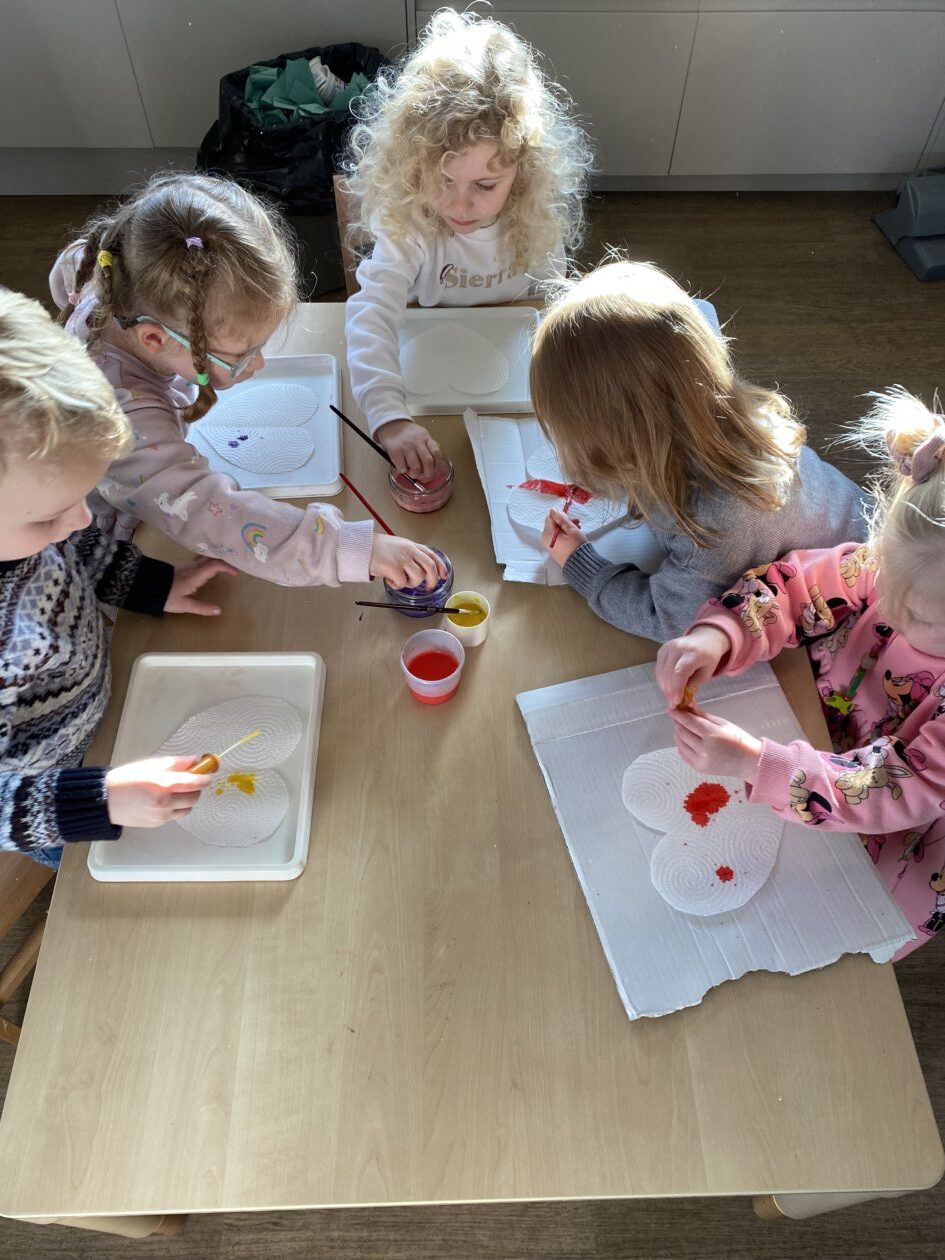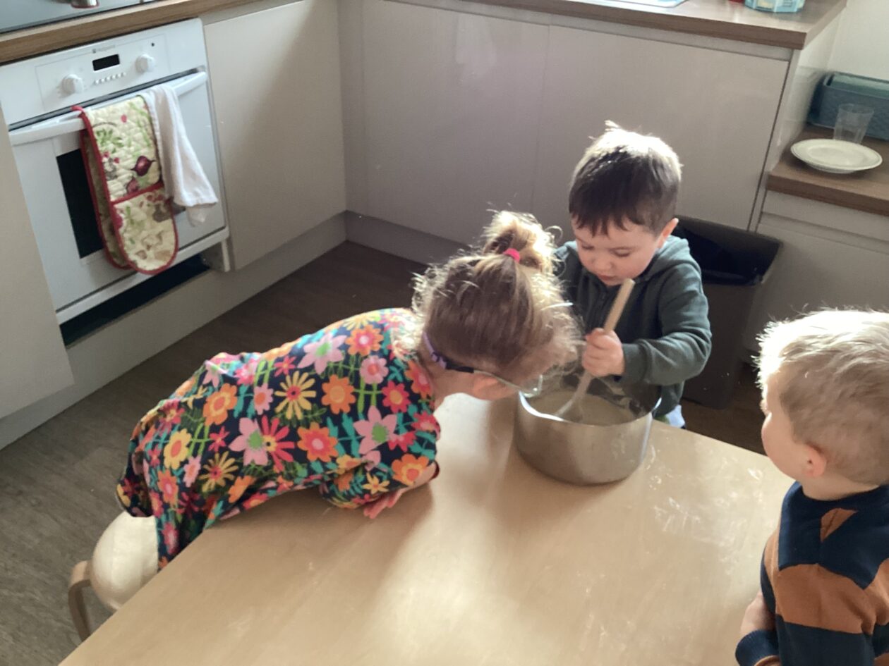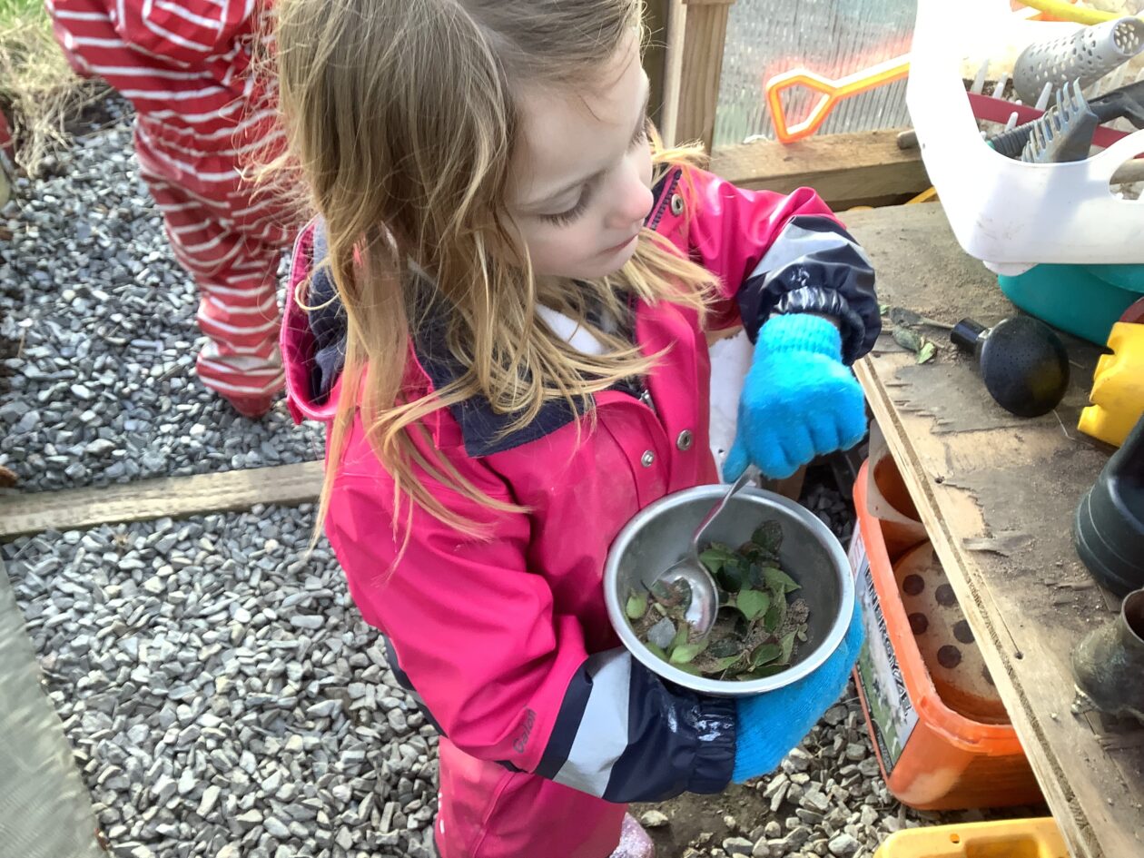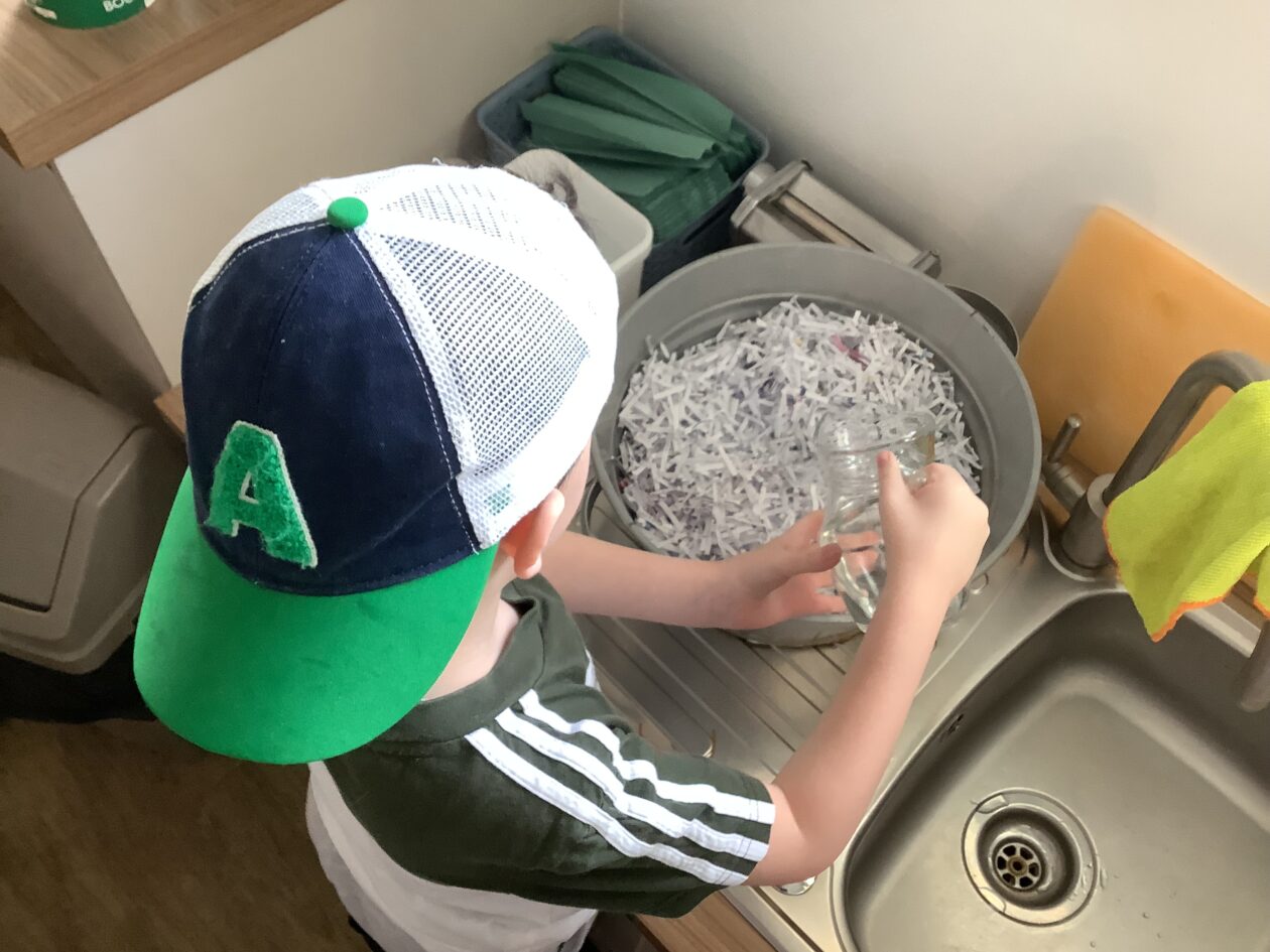 The paper making was a success! The bairns were very excited to see if the pulp had dried and carefully pulled it away from the cloths trying not to tear it. They found some leaves from the garden and fading valentines day flowers for printing using the hammers and rolling pins to see if the colours would come on to their paper. ‘The pink is there and my flower is squishy now.’ We explored the differences between hitting harder and softer with the hammer and how the colours were different because of this.