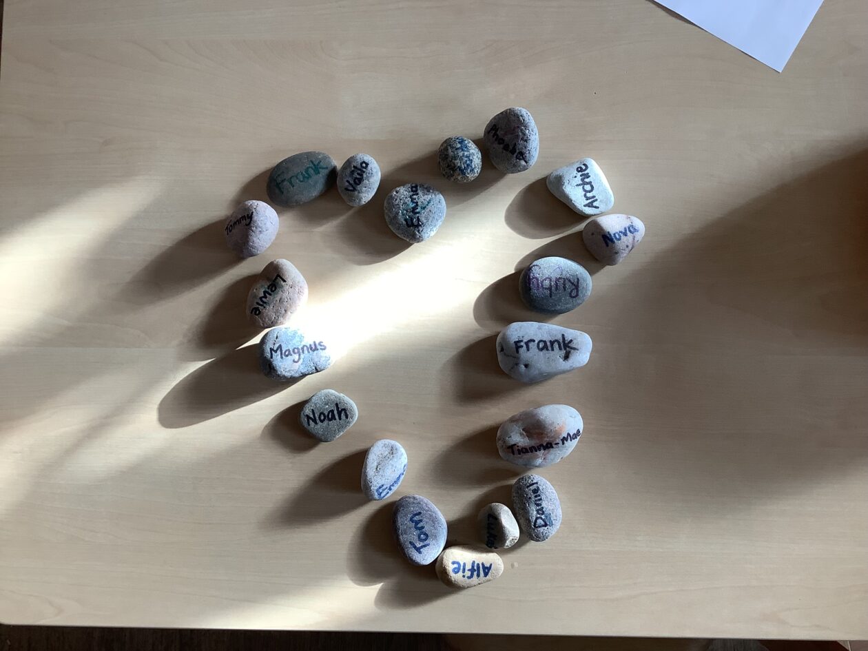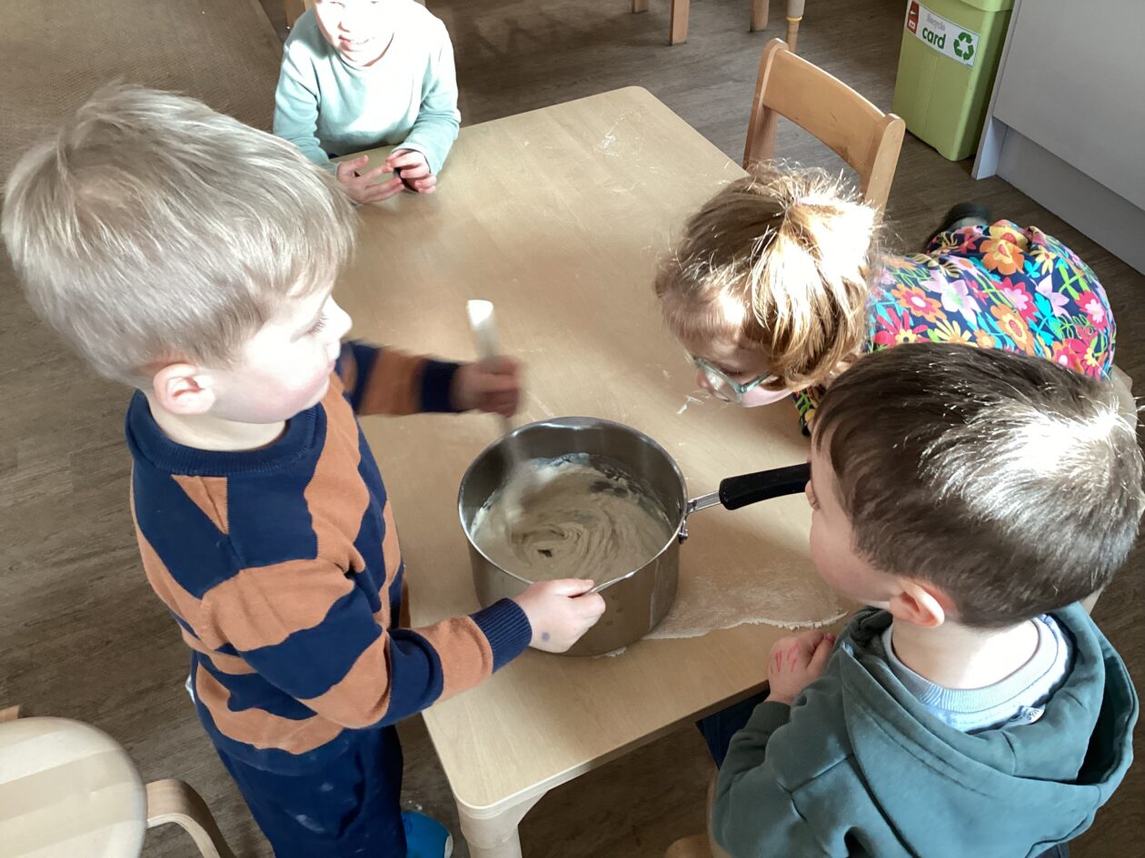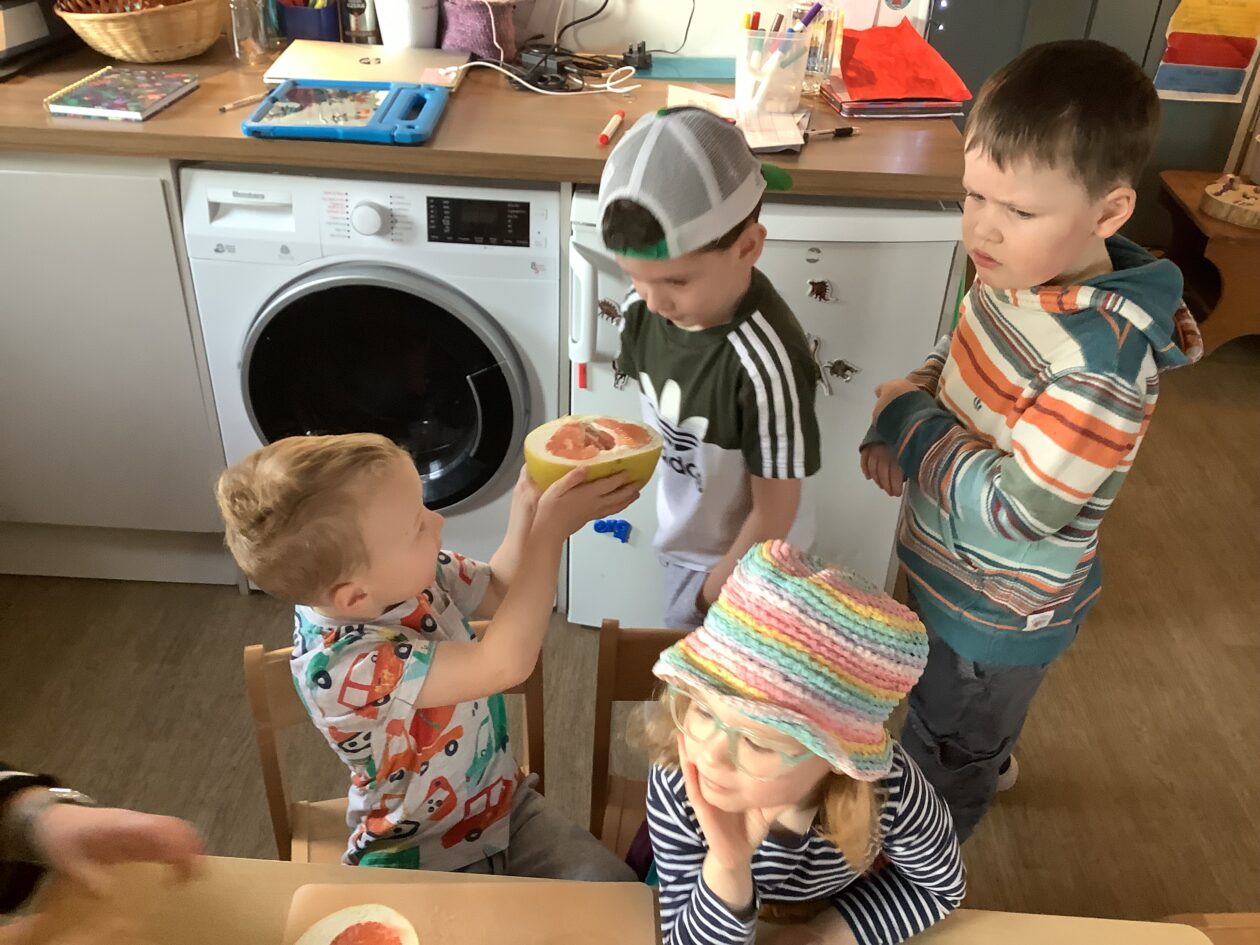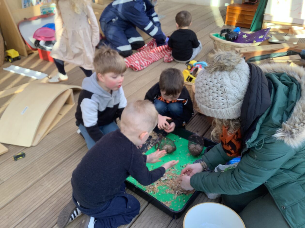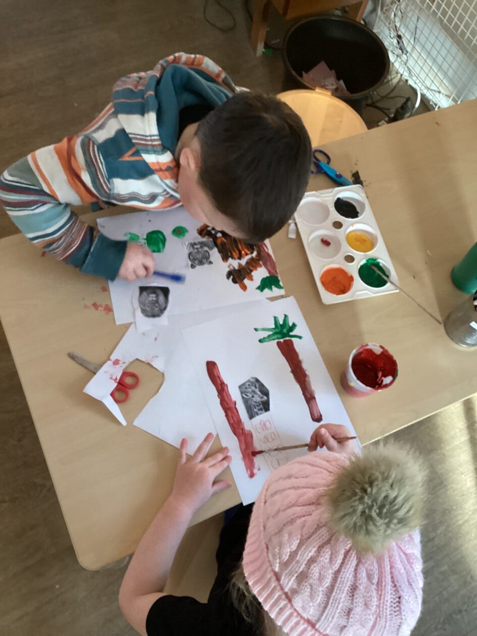 The paper making was a success! The bairns were very excited to see if the pulp had dried and carefully pulled it away from the cloths trying not to tear it. They found some leaves from the garden and fading valentines day flowers for printing using the hammers and rolling pins to see if the colours would come on to their paper. ‘The pink is there and my flower is squishy now.’ We explored the differences between hitting harder and softer with the hammer and how the colours were different because of this.