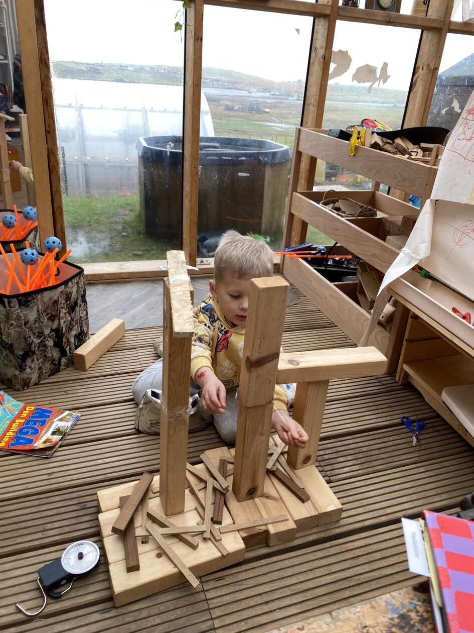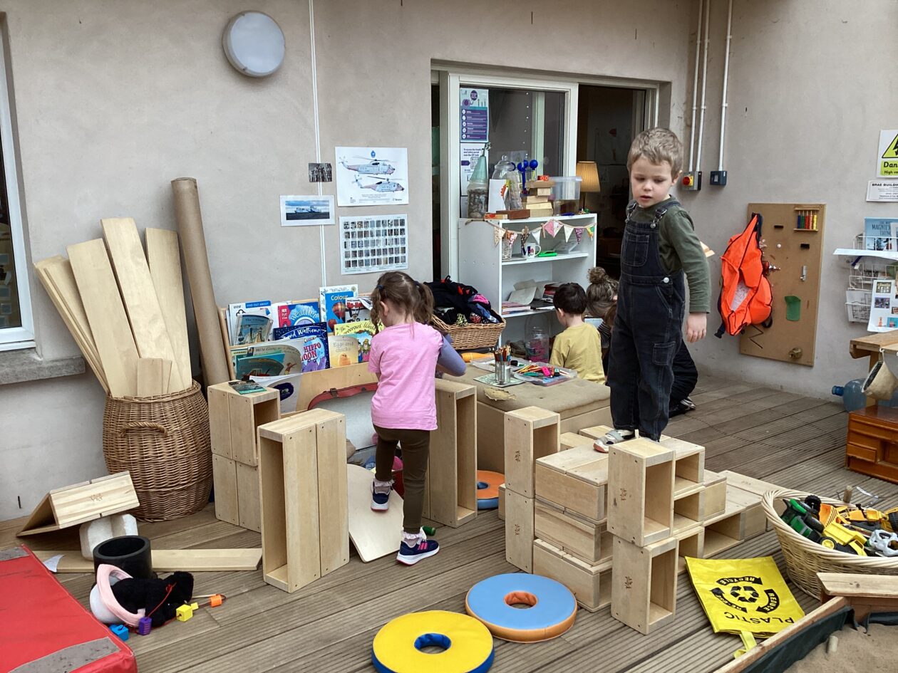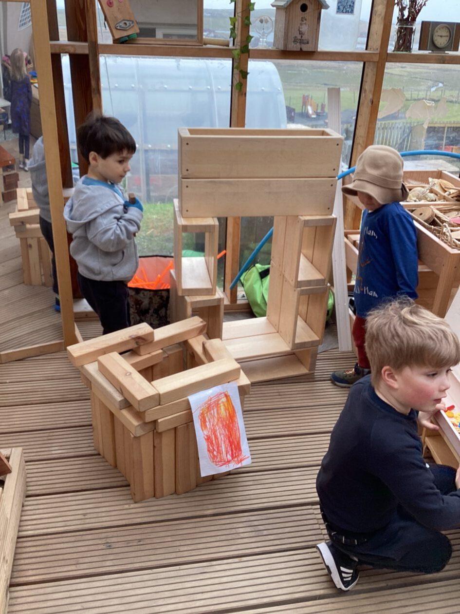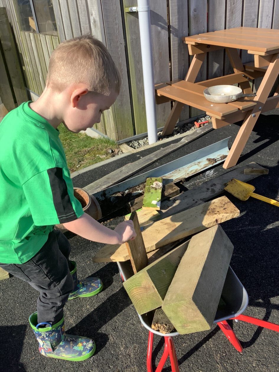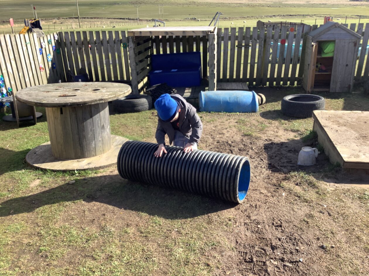 The outdoor room is always a popular choice and a great place to observe schemas (a repeated action used to explore and test theories in play). The bairns have used positioning, transporting, trajectory, enveloping, rotation and enclosure schemas in their play this week. They made paper aeroplanes and then built a platform to launch their planes from, watching how far they flew. They have also been engaged in imaginative play using the large hollow blocks and cable drums as fishing boats. “He is da een dat goes in da water. He is da fishing een and I’m da Captain.”
