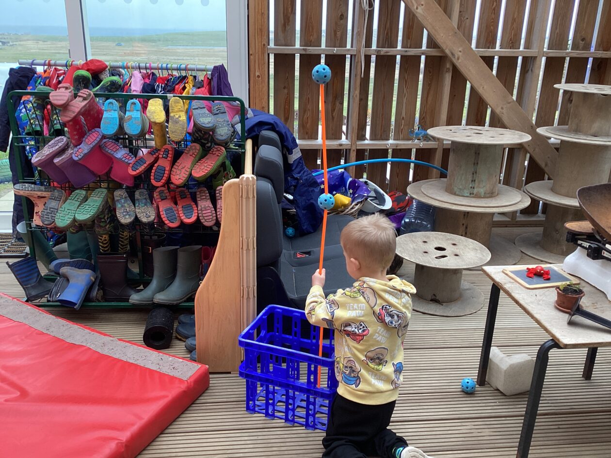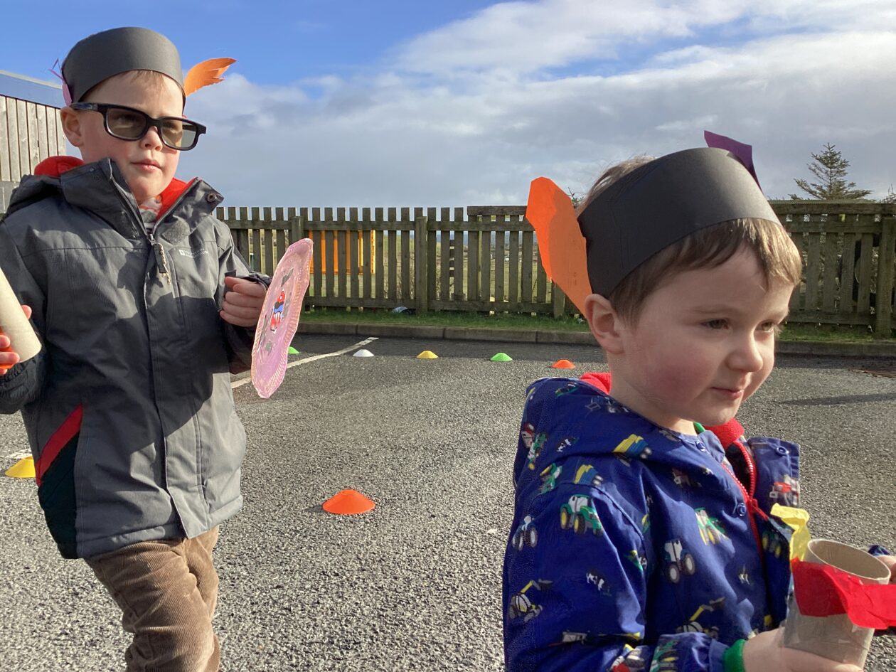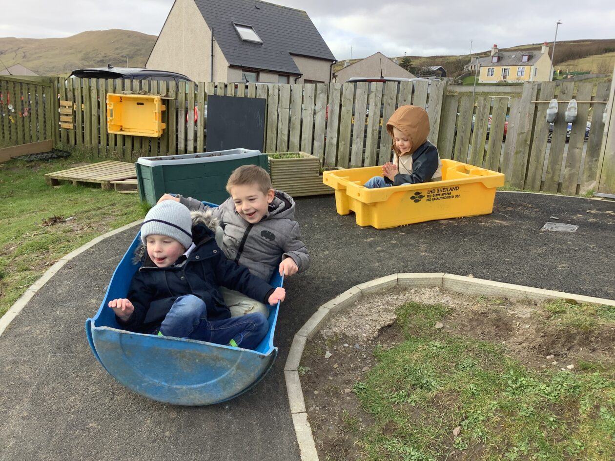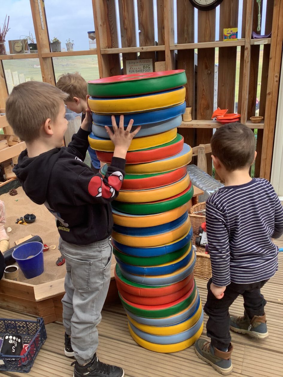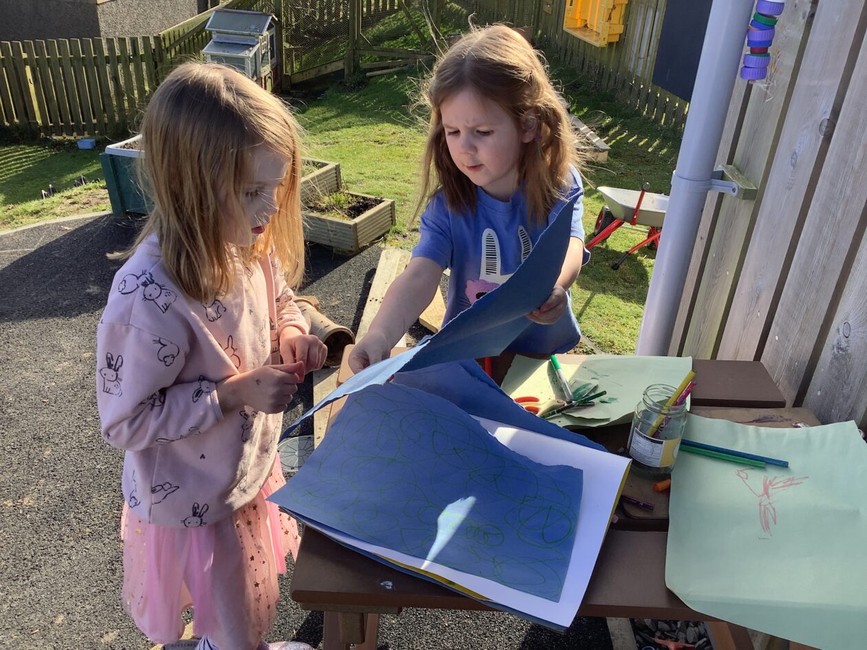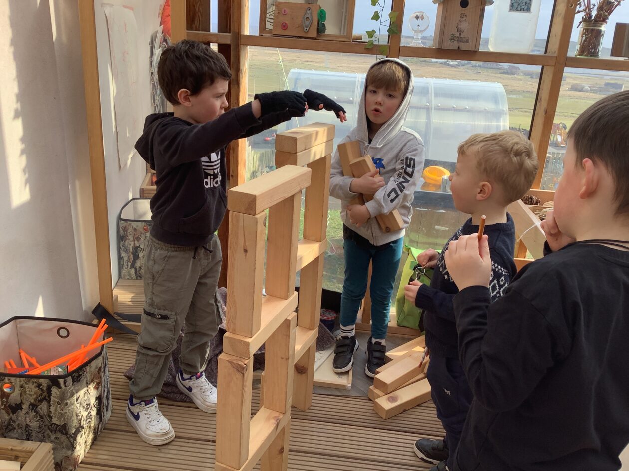 The outdoor room is always a popular choice and a great place to observe schemas (a repeated action used to explore and test theories in play). The bairns have used positioning, transporting, trajectory, enveloping, rotation and enclosure schemas in their play this week. They made paper aeroplanes and then built a platform to launch their planes from, watching how far they flew. They have also been engaged in imaginative play using the large hollow blocks and cable drums as fishing boats. “He is da een dat goes in da water. He is da fishing een and I’m da Captain.”
